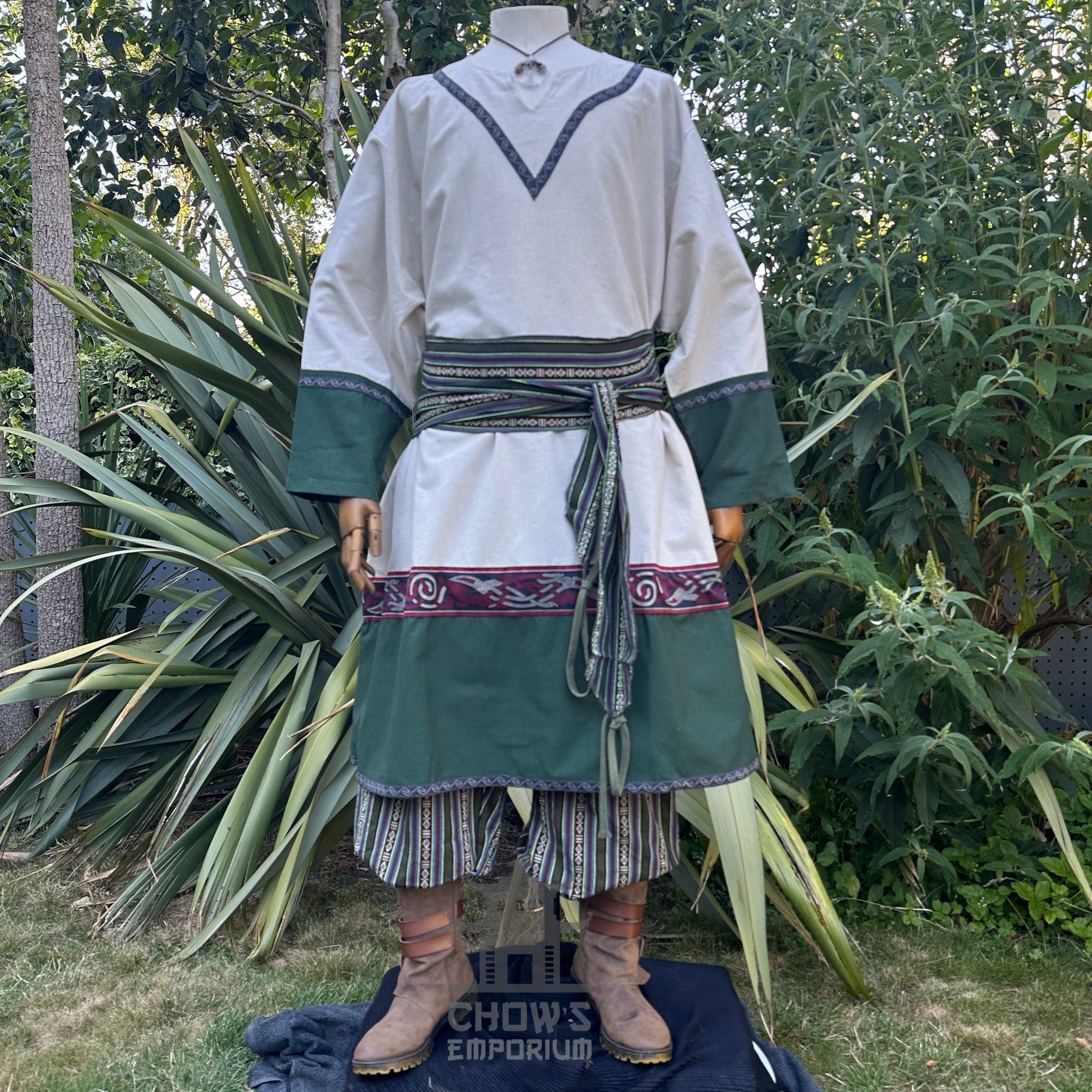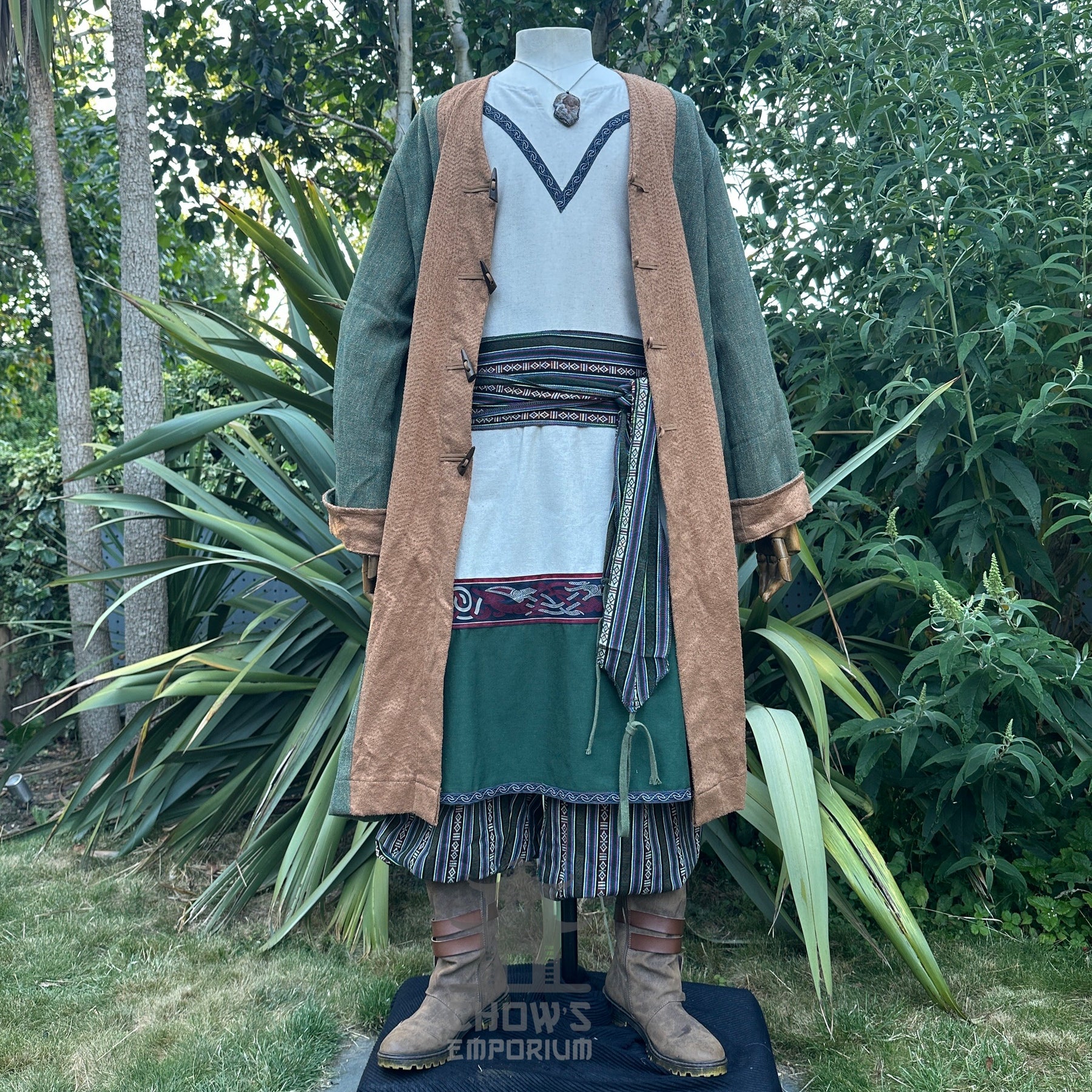 Dieser kunstvolle Lagenmantel ist reich verziert mit Wollstoffen in verschiedenen Texturen und einer Reihe mehrfarbiger Borten. Er verfügt über eine doppellagige Frontplatte, die mit Hornknöpfen geschlossen wird. Dieser Artikel kann als Tunika oder Mantel getragen werden und ist ein komplettes Kostüm für sich. Geeignet für alle Mittelalter-, Fantasy- oder Cosplay-Umgebungen.