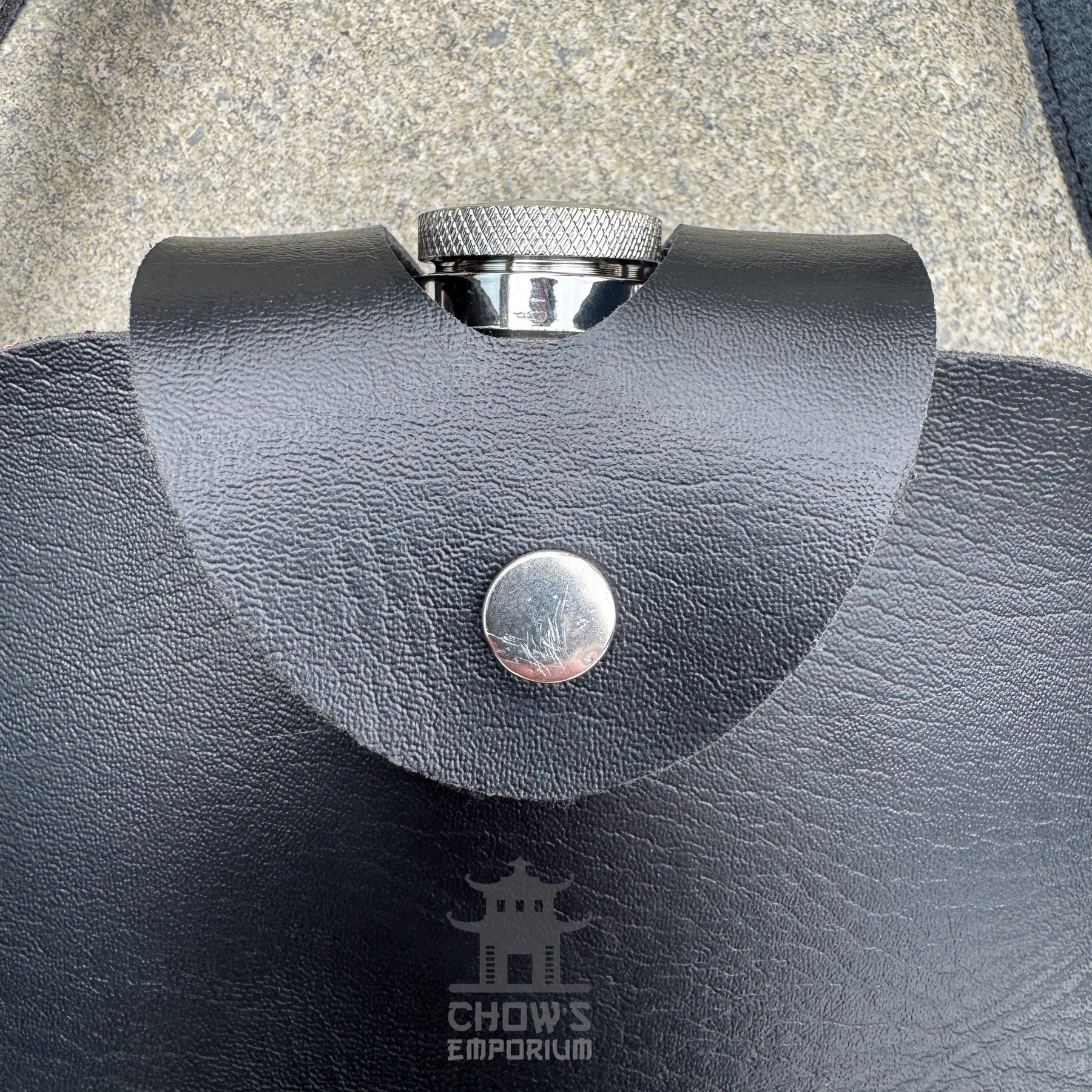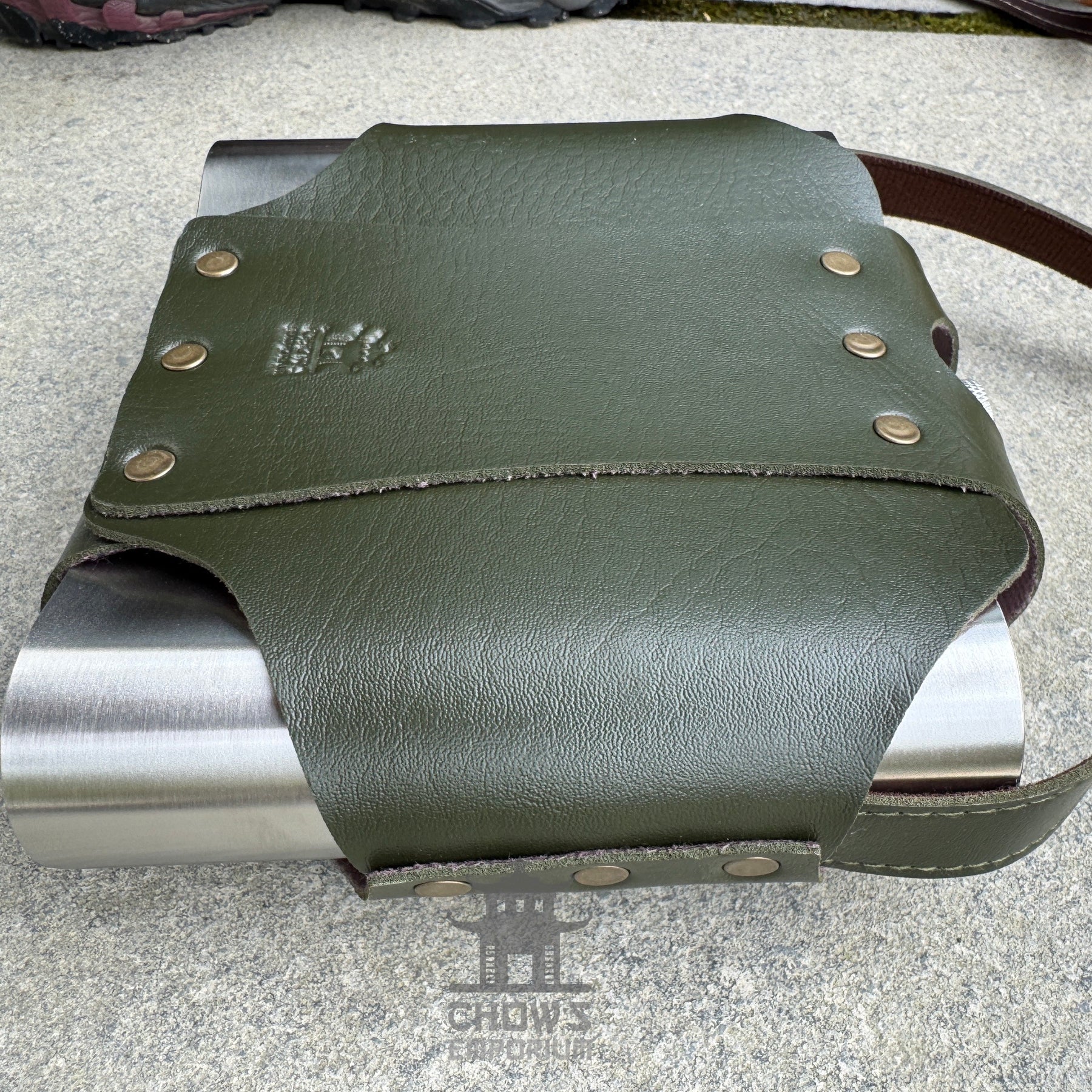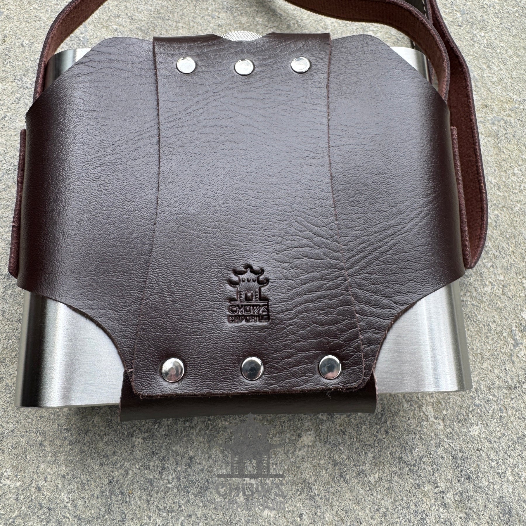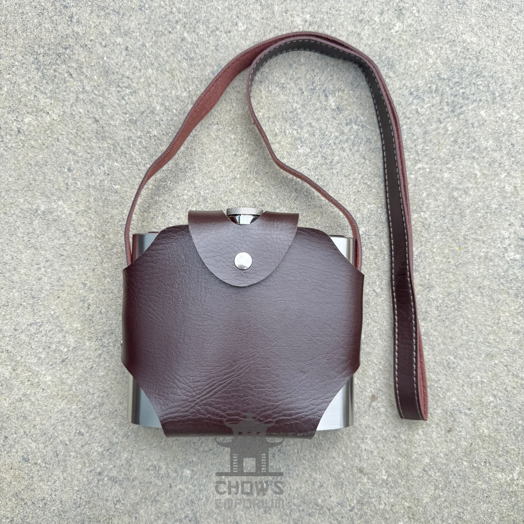 32oz Stainless steel hip flask in a faux leather holder. The shoulder strap allows you to wear the flask across your body for easy access while keeping your hands free for quests, trading, or battle. A secure screw cap prevents leaks, while the leather carrier keeps your flask protected and easy to carry.