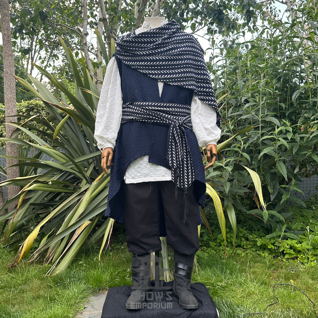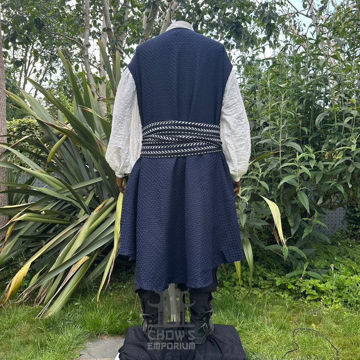 Pirate Waistcoat – Mid-length cotton-mix waistcoat with a versatile herringbone textured wool panel, asymmetrical front, and flowing back for dramatic movement. Includes matching sash for a polished look.