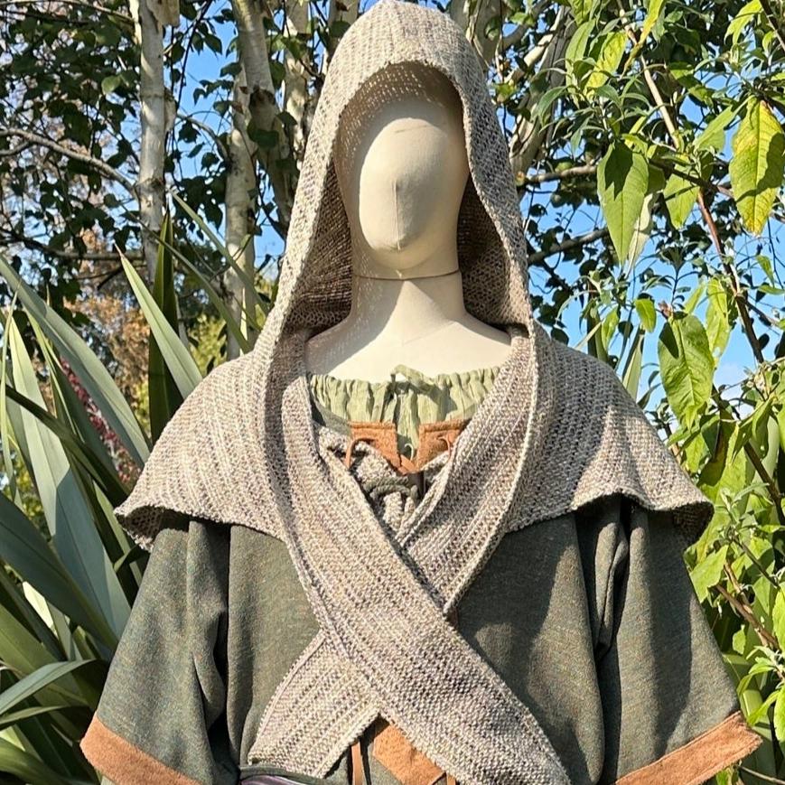 A new design from us, we've taken our standard hood using the same type of warm textured woollen material and lengthened the material at either end so you can create various new looks according to your costume/characters needs.
