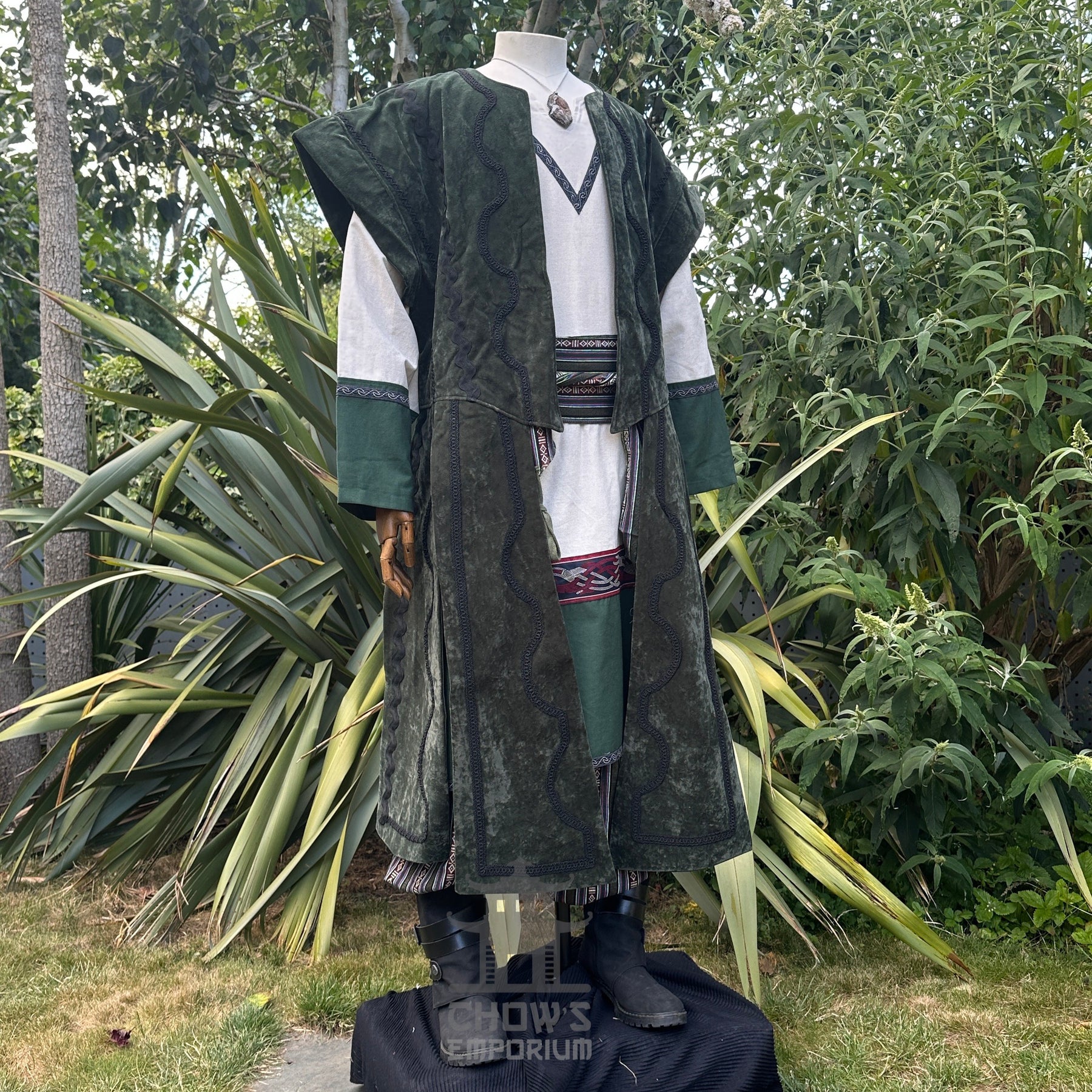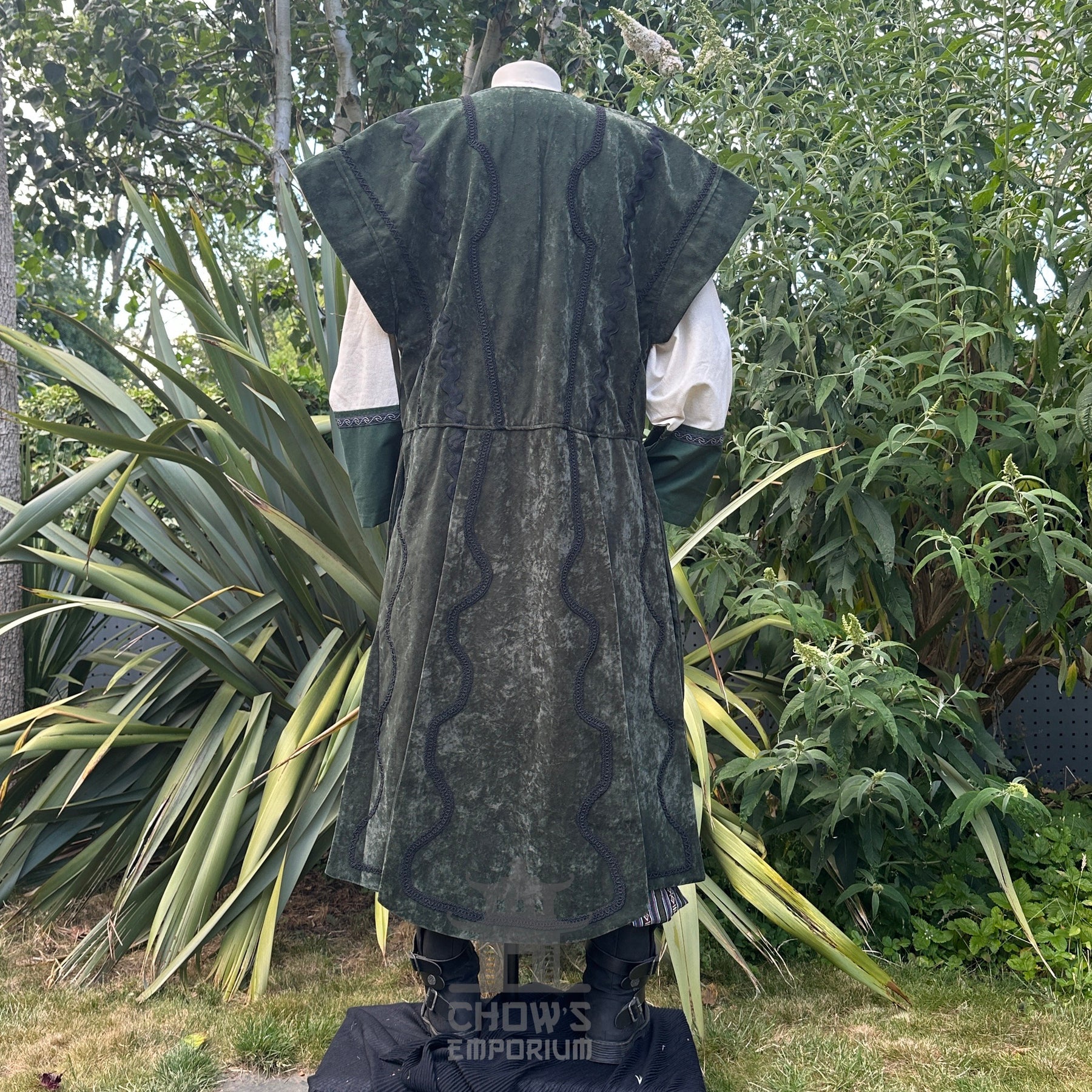 Suede Effect Panel Waistcoat – Striking waistcoat with panelled suede-effect fabric, flowing panels, and ornate braiding for dynamic movement and a dramatic silhouette. Broad shoulders and wide armholes allow layering over tunics or under armor.