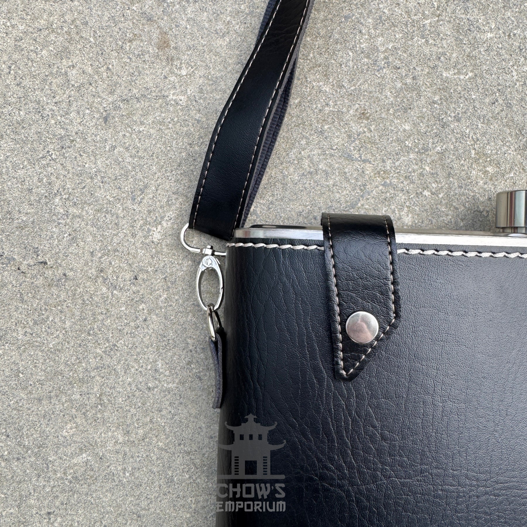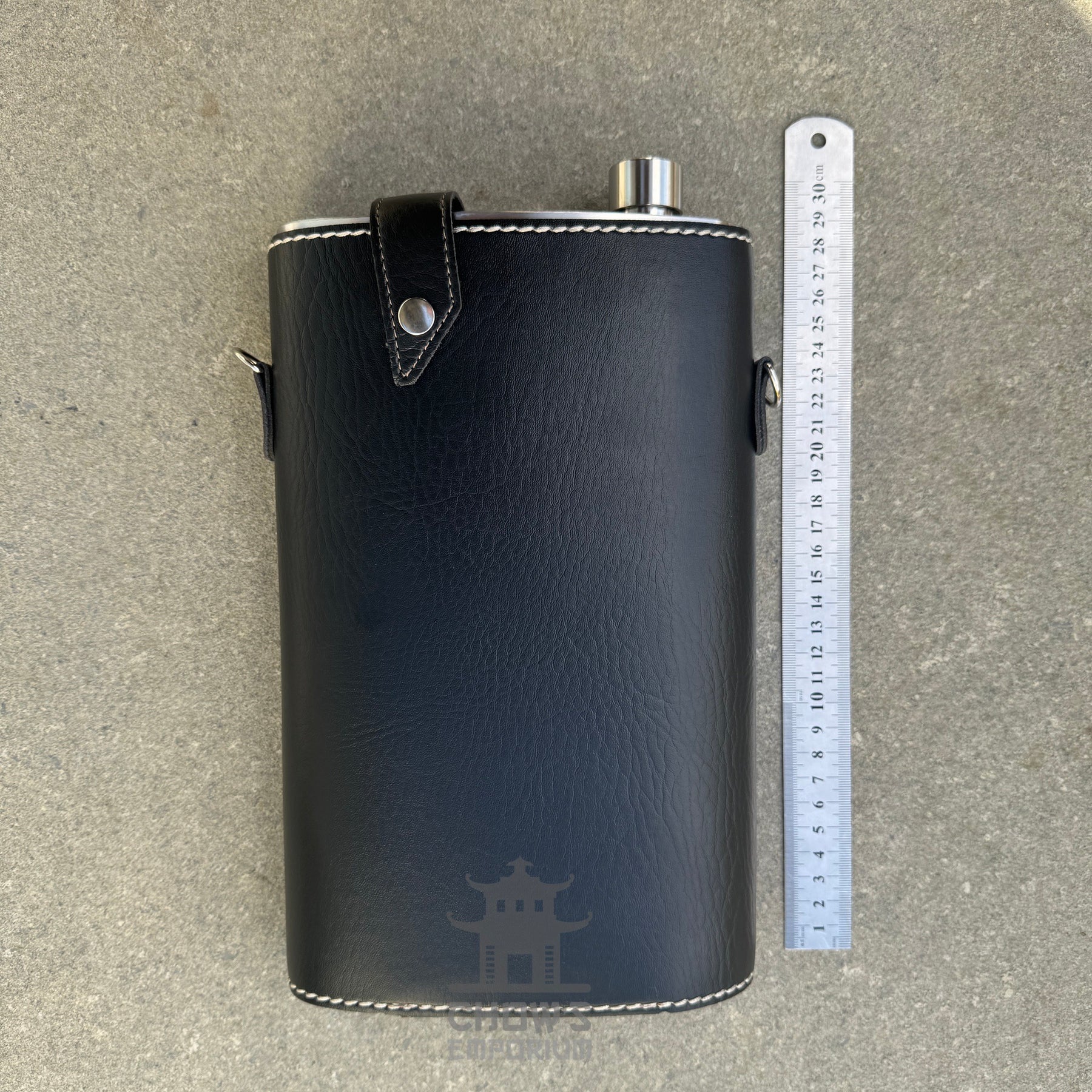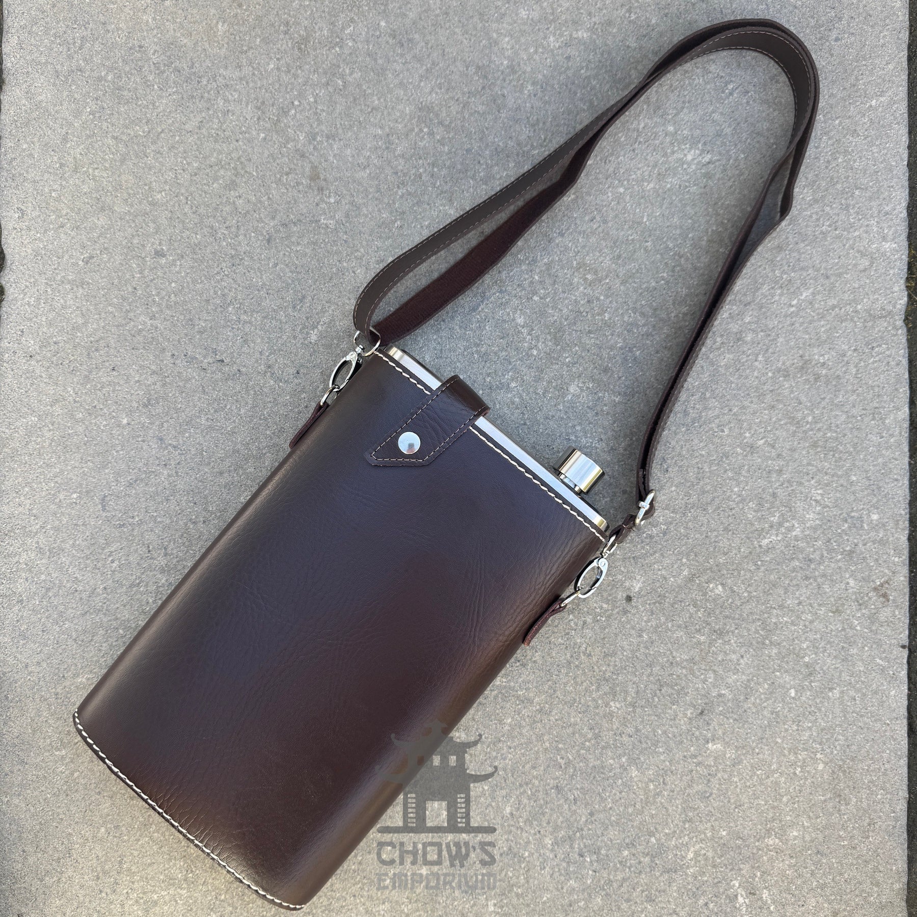 64oz Rectangular Hip Flask in a Faux Leather Carrier with Adjustable Shoulder Strap