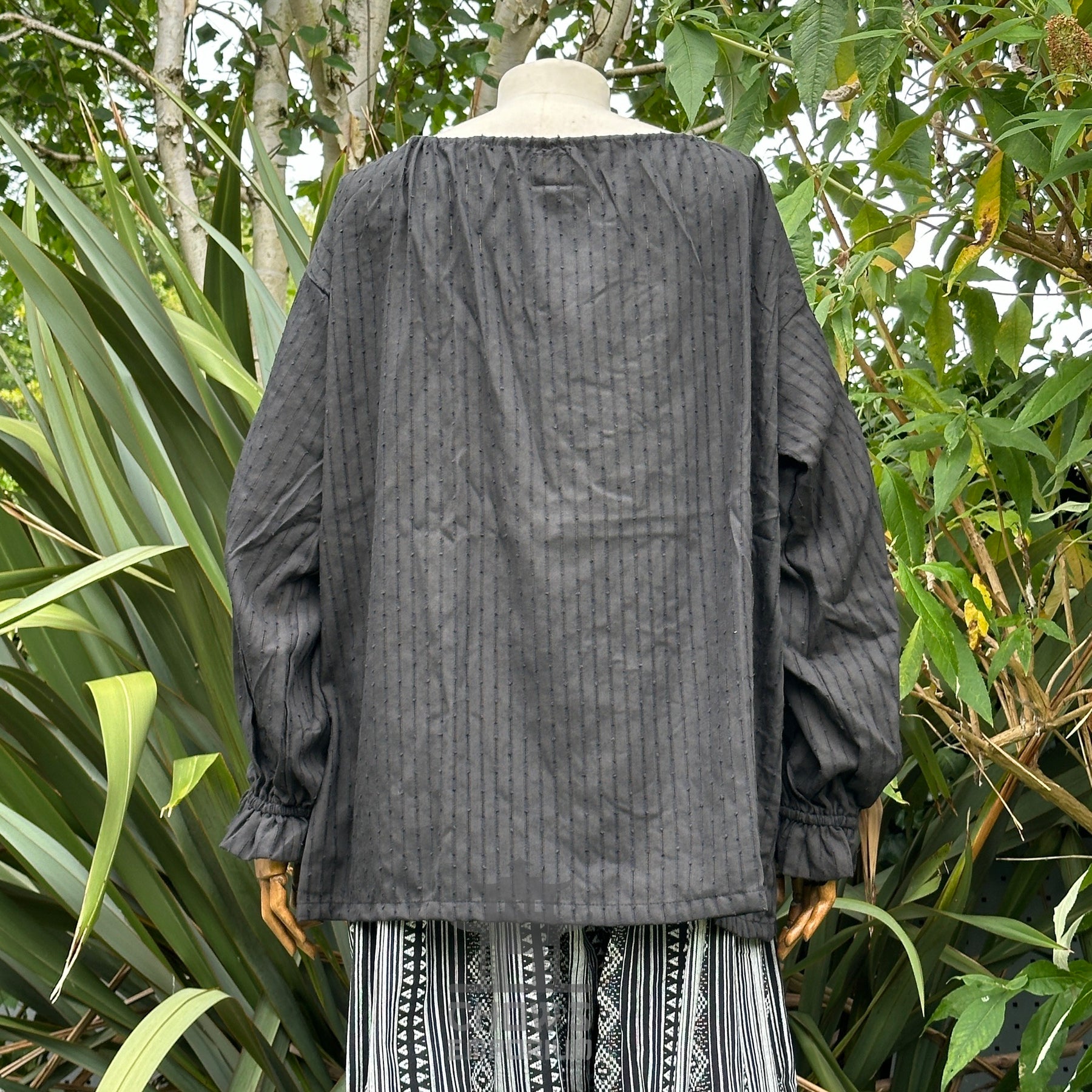 Medieval Shirt Round Neck – Textured cotton shirt with adjustable tie neck and frilled cuffs. Breathable, lightweight, and unisex.