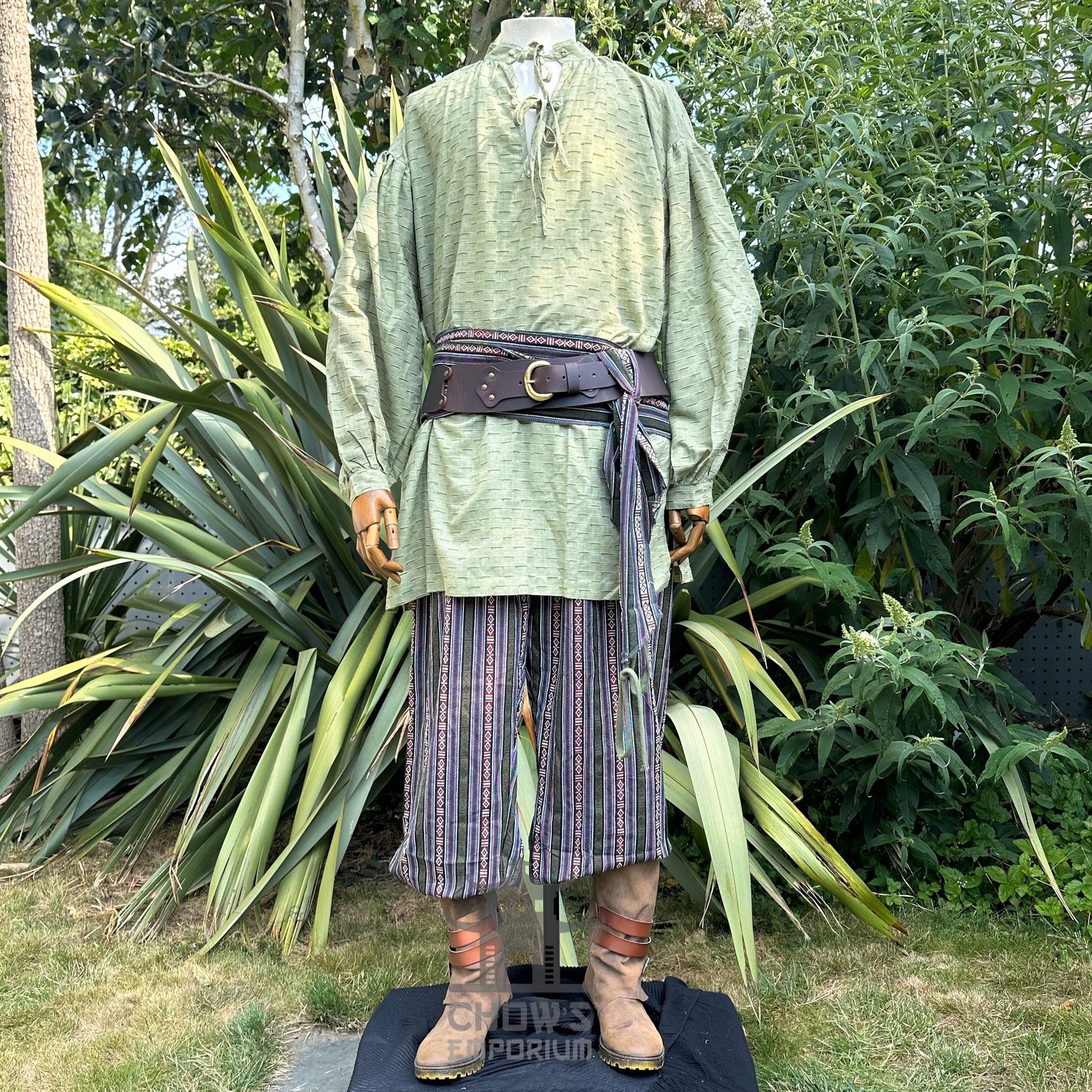 LARP Basic Outfit - 3 Piece Green & Multi Striped (Medieval Shirt, Pants & Sash)
