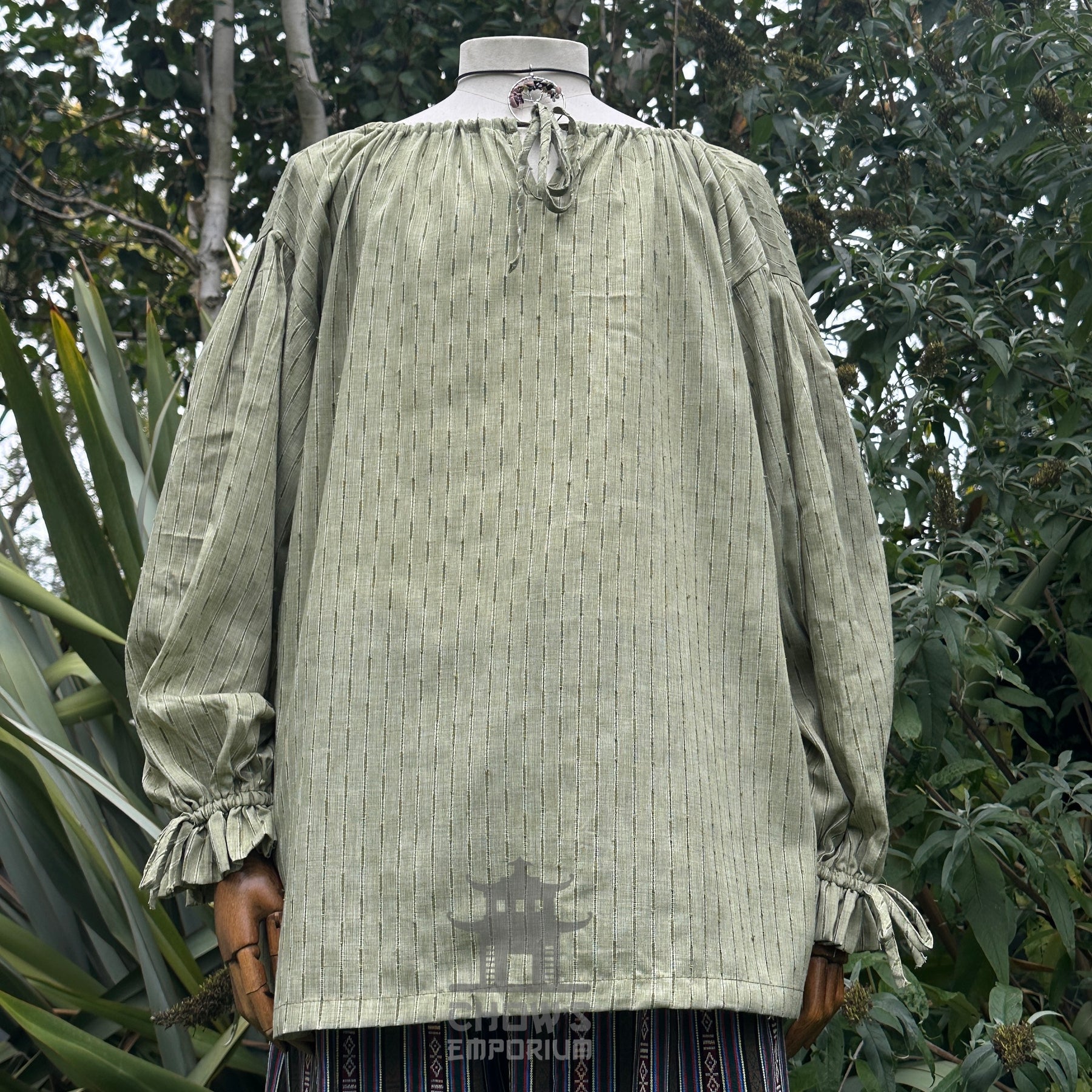 Medieval Shirt Round Neck – Textured cotton shirt with adjustable tie neck and frilled cuffs. Breathable, lightweight, and unisex.