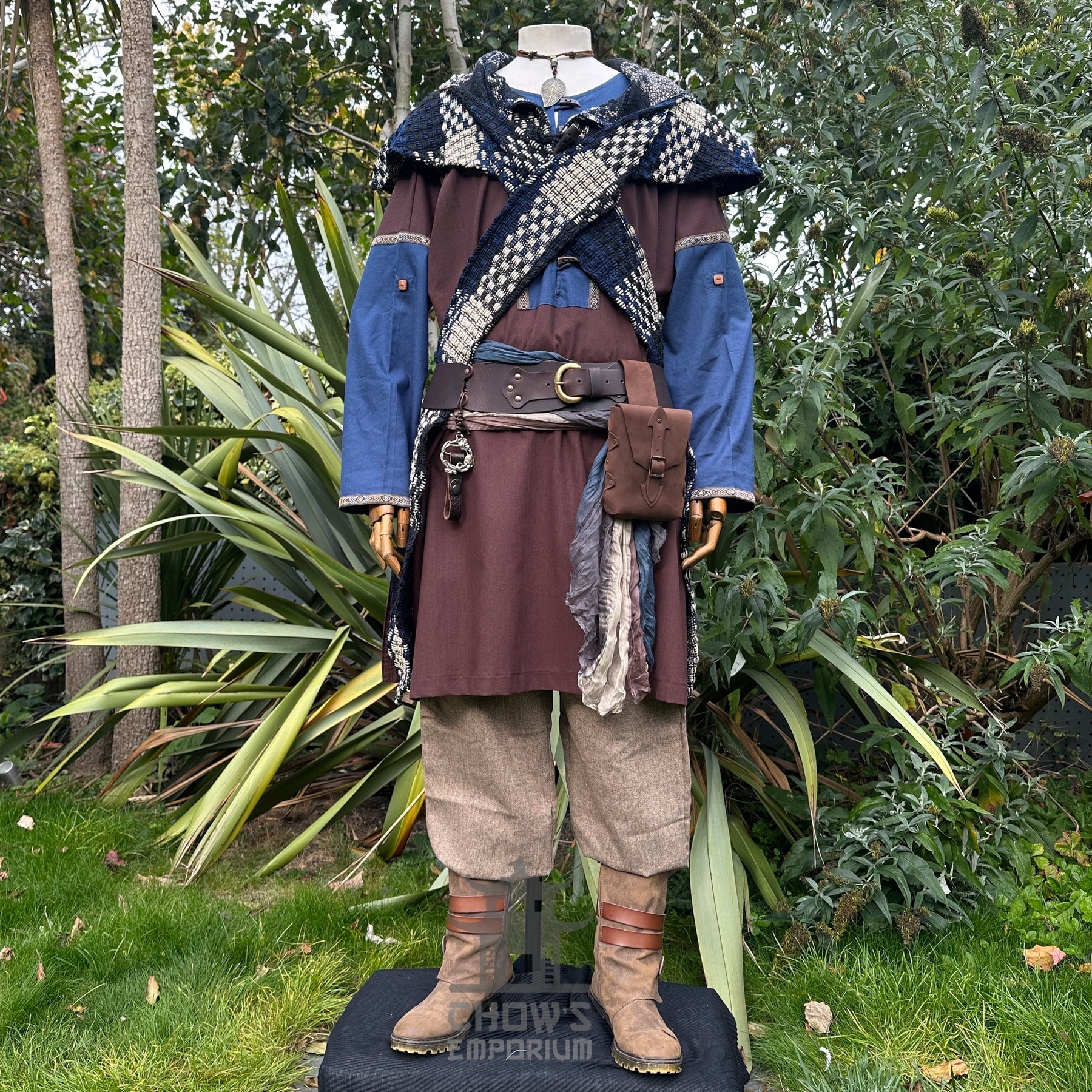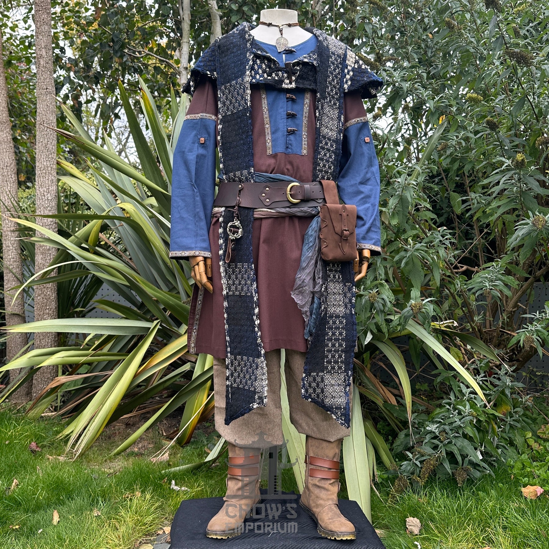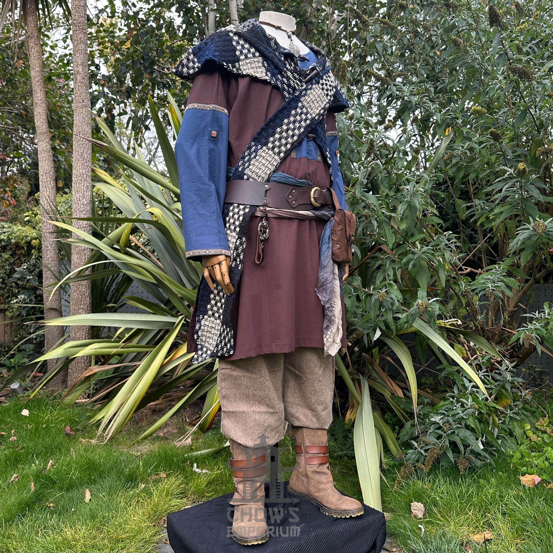 Two-tone brown and blue cotton-linen tunic with horn-shaped wooden buttons. Lightweight, breathable, and ideal for layering under cloaks, armor, or other tunics.