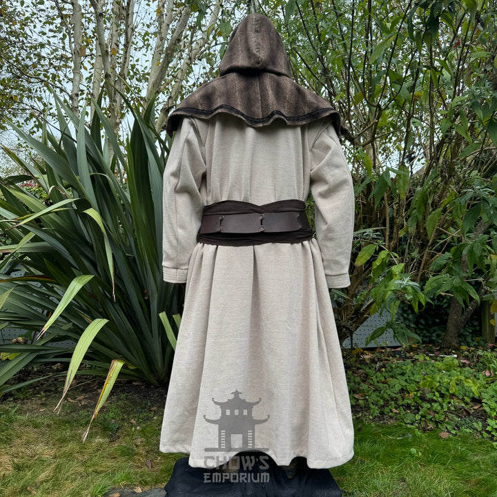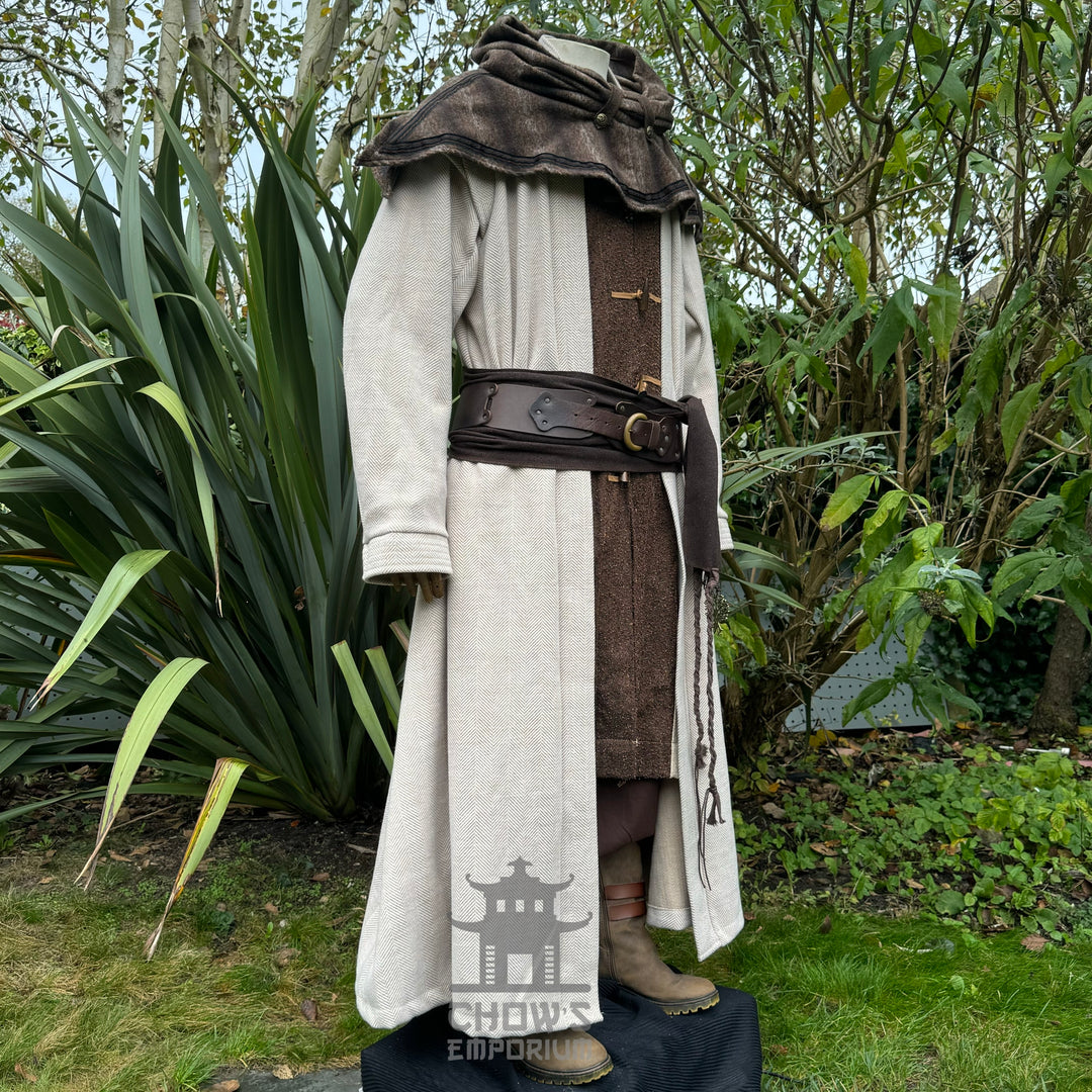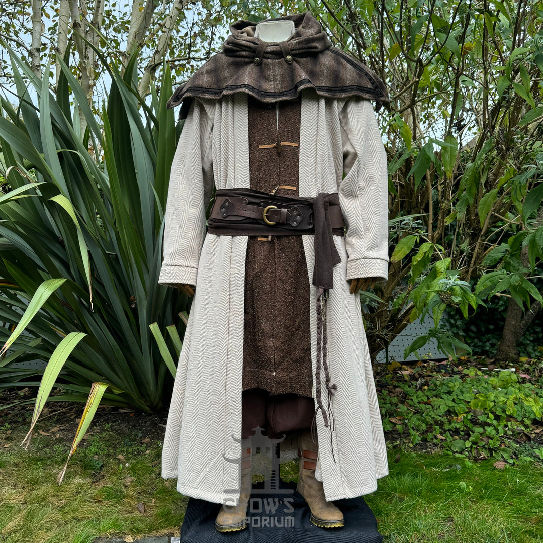 The Medieval Woodland Wizard LARP Outfit features a noble, adventure-ready robe crafted from breathable, warm, and durable herringbone wool. Designed for versatility, it can be worn open or belted for a heroic, fantasy-inspired look. Perfect for LARP events, renaissance fairs, and medieval or fantasy roleplay, this costume brings authentic style to every adventure.