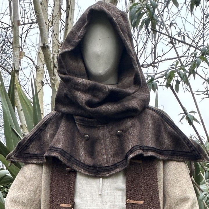 Mohair Snood Hood – Warm mohair-wool blend snood with versatile wrap-around mantle designed for LARP, cosplay, and Renaissance Faires. Wind- and rain-resistant, with buttoned straps for multiple styling options. Even weight distribution ensures comfort for extended wear.