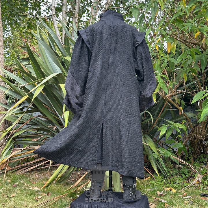 The Medieval Night Warlock LARP Outfit features a dramatic wool-mix cape with faux fur trim and roomy hood, and a wool-blend robe with high collar and flared back. Perfect for LARP, renaissance fairs, fantasy events, and cosplay, this set combines comfort, style, and immersive medieval-inspired design.