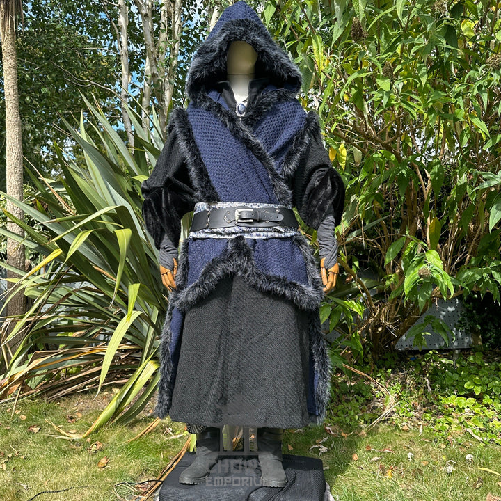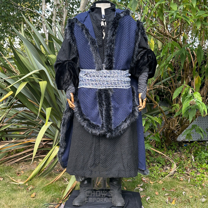 Medieval LARP costume front view, featuring a blue faux fur trim hooded cape, black high collared robe, and sash. For Renaissance Faire and historical roleplay events.