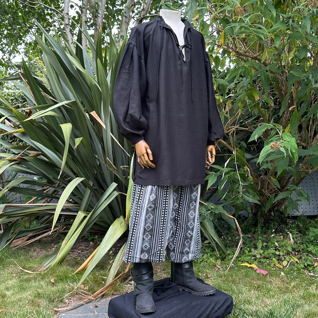 Viking Pants – Durable textured cotton pants with a baggy, calf-tapered fit, elasticated waist with cord tie, and crossover lacing. Includes pockets for practicality.