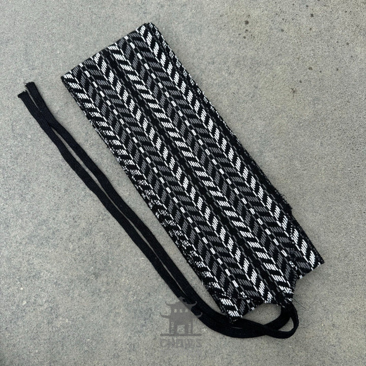 Medieval Sash – Black and white herringbone wool sash with fringed edges, long length for wrapping or draping. Warm, unisex, perfect for layering over tunics, cloaks, or armor.