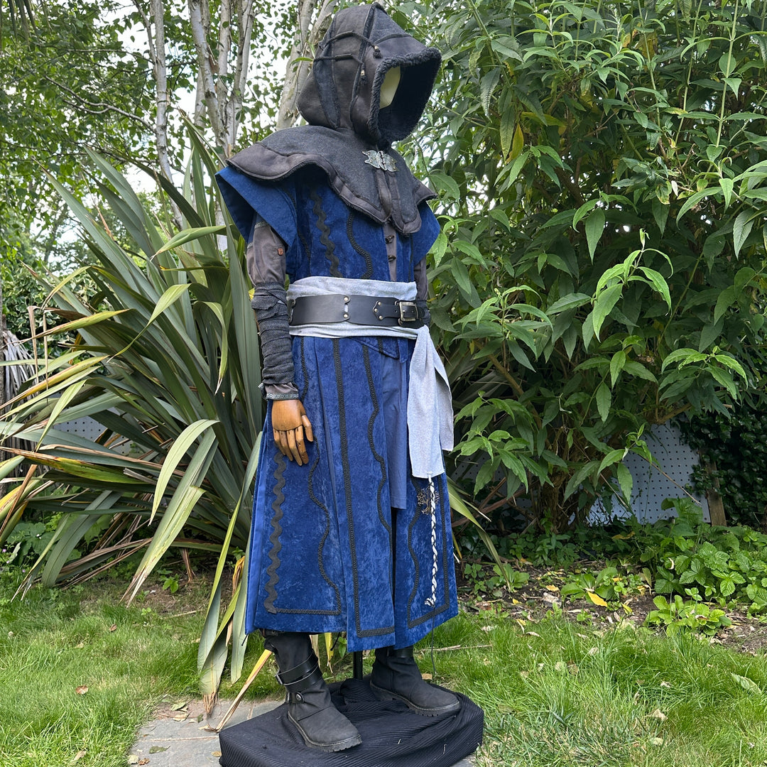 The Medieval Storm King LARP Outfit features a striking suede-effect panel waistcoat, and black layered hood crafted from faux leather and herringbone wool. Perfect for character creation, immersive LARP experiences, or standing out at any Historical, Fantasy, or Renaissance event.