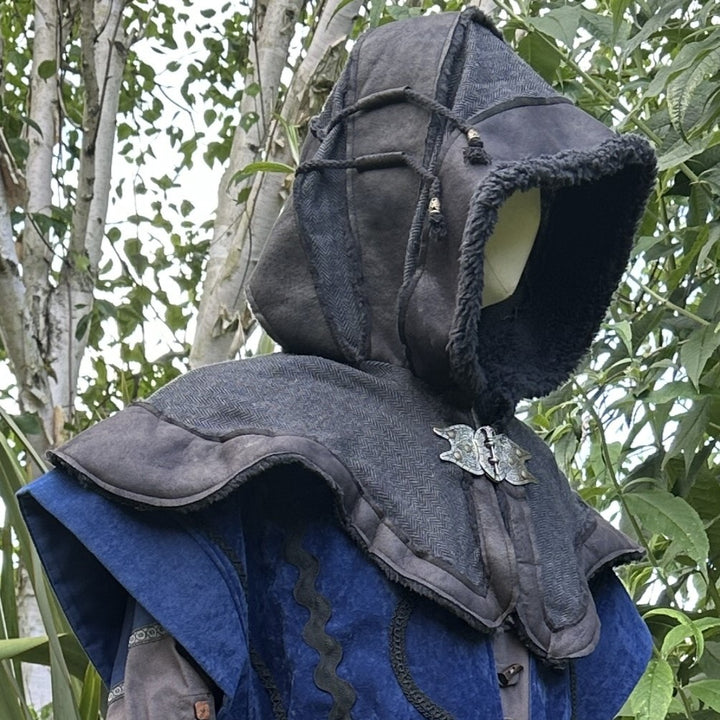 Layered Adventure Hood – Premium hood for LARP, cosplay, and Renaissance Faires, combining black faux leather and grey herringbone wool for a striking layered look. Soft fleece lining and adjustable braided cords ensure comfort and a secure fit during action or adventure. Limited edition.