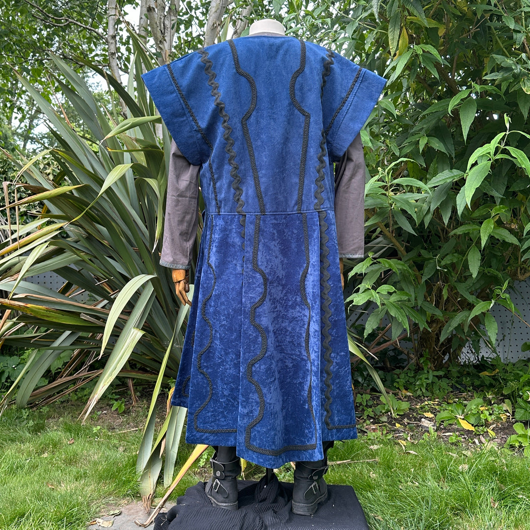 Suede Effect Panel Waistcoat – Striking waistcoat with panelled suede-effect fabric, flowing panels, and ornate braiding for dynamic movement and a dramatic silhouette. Broad shoulders and wide armholes allow layering over tunics or under armor.
