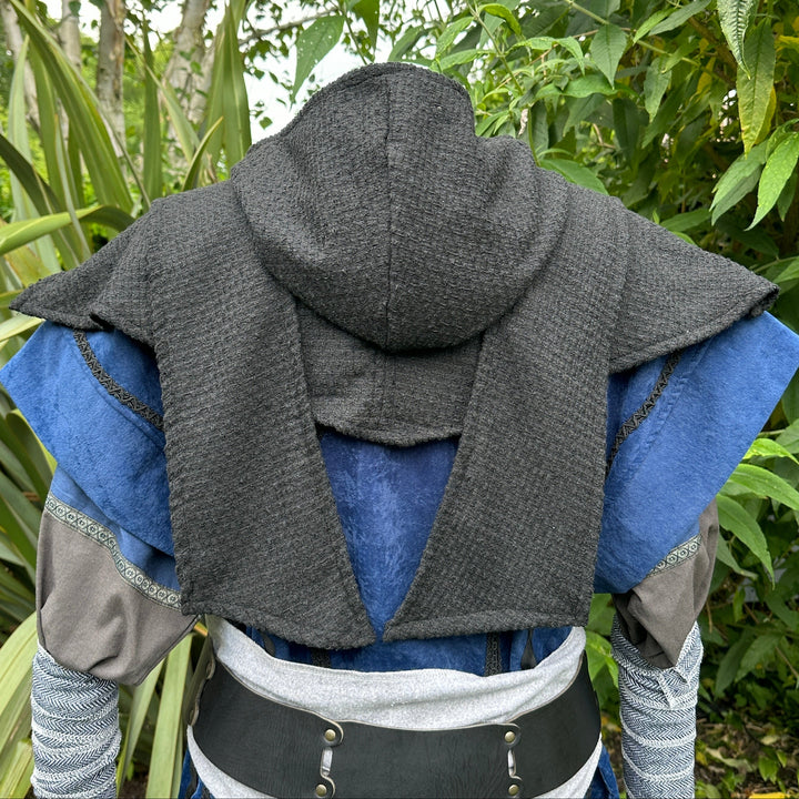 Wool Wrap-Around Hood – Versatile medieval cowl and mantle for LARP, cosplay, and Renaissance Faires. Made from warm, textured wool with extra-long wrap-around ends for multiple styling options.