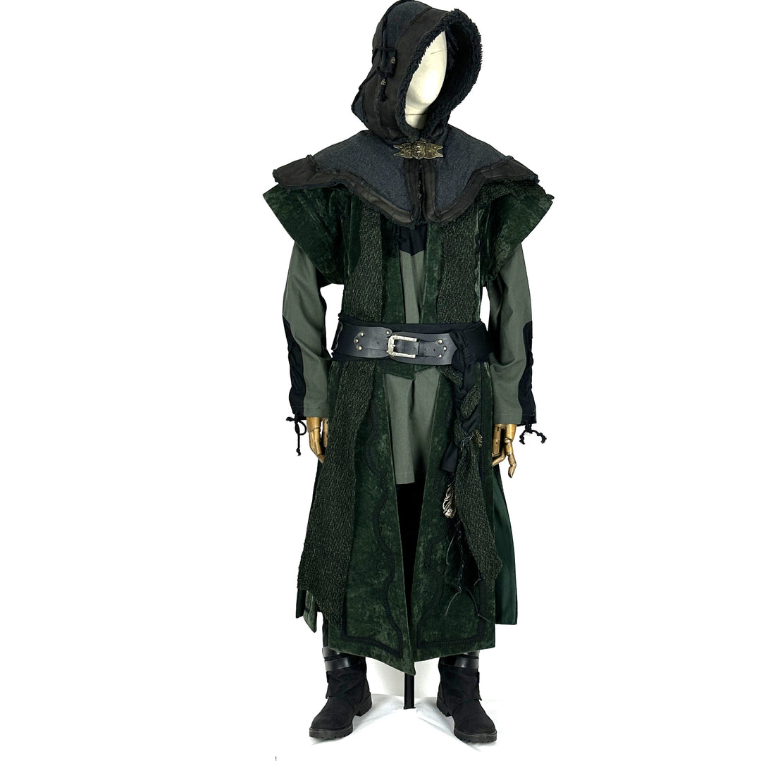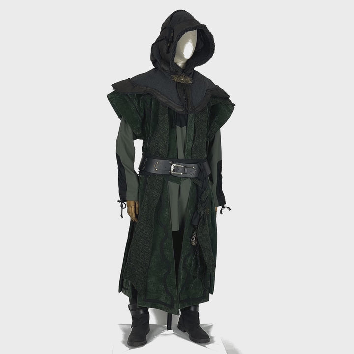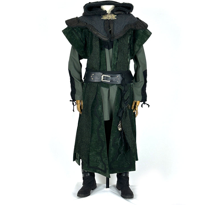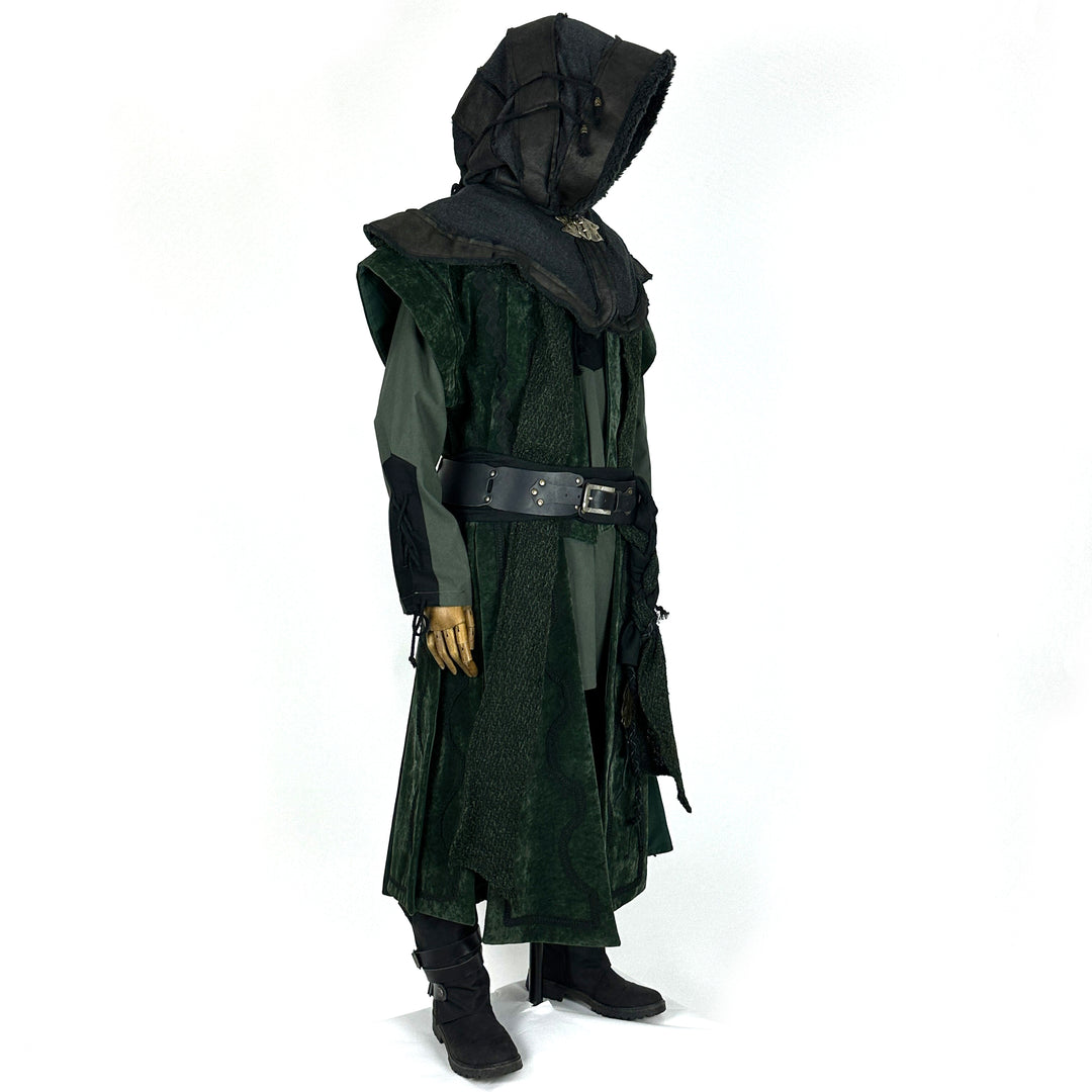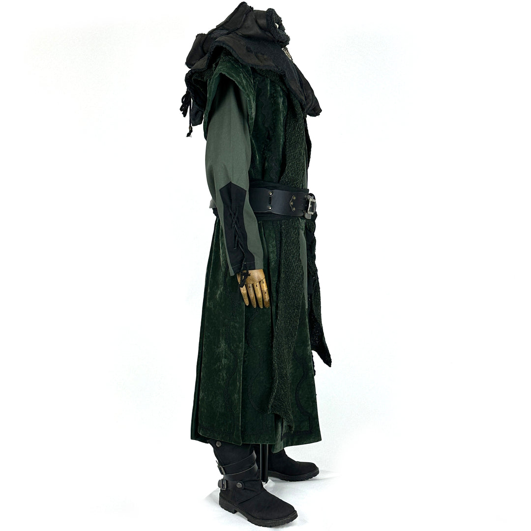 This Medieval Twilight Rogue LARP Outfit features our signature suede-effect panel waistcoat, and a black layered hood crafted from faux leather and herringbone wool. Perfect for character creation, immersive LARP experiences, or standing out at any Historical, Fantasy, or Renaissance event.