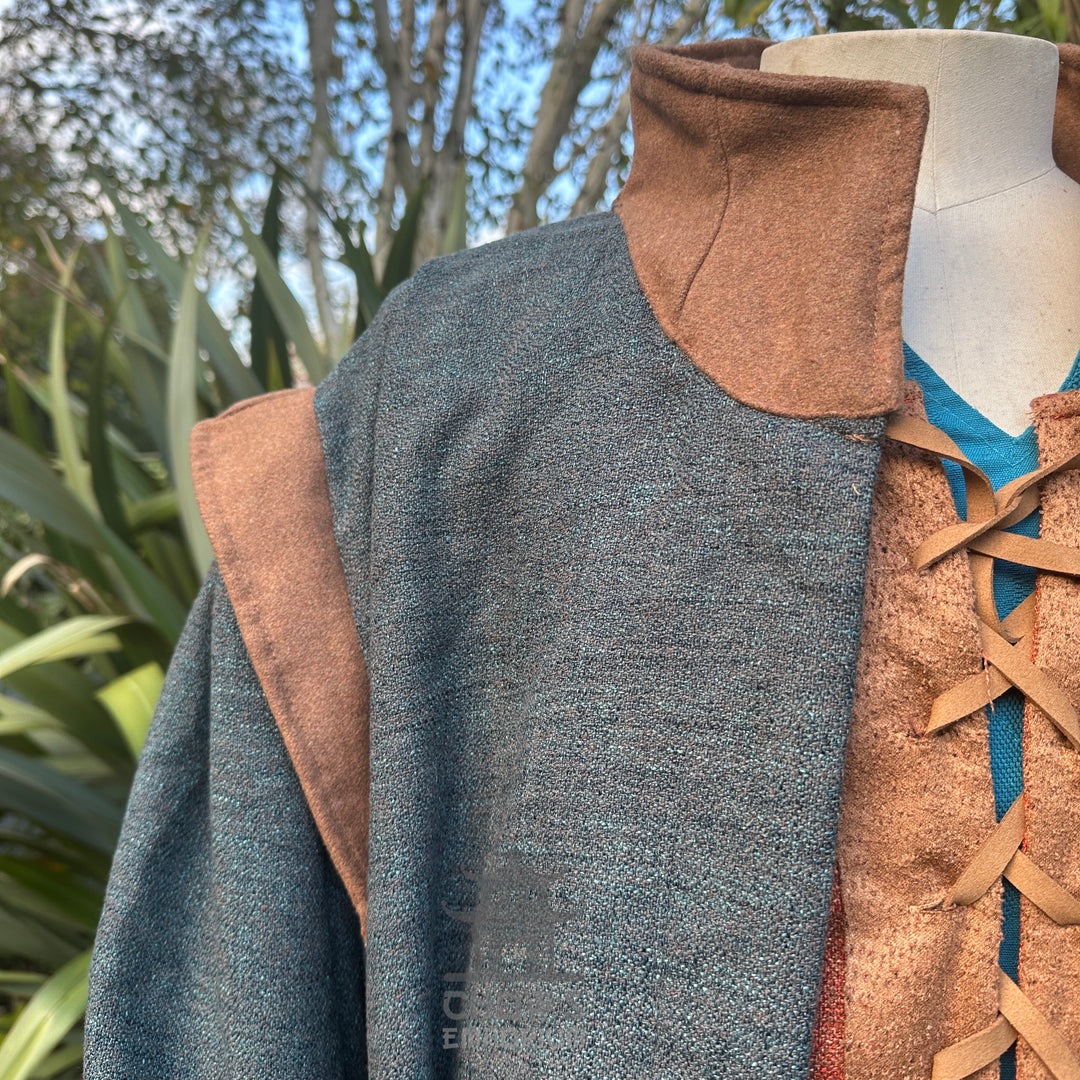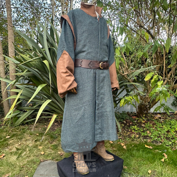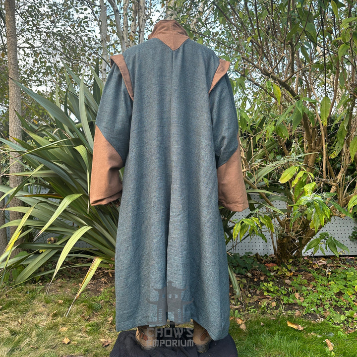 This long robe, constructed from textured fabric with contrasting neck, shoulder and sleeve details, combines elegance with functionality. Featuring a high collar for a distinguished look, its large armholes allow for a wide range of movement, and the longer sleeves protect your hands when wearing vambraces - perfect for LARP and Renaissance Faires. The robe's back flare adds a touch of drama, ensuring your stride and movements flow gracefully.