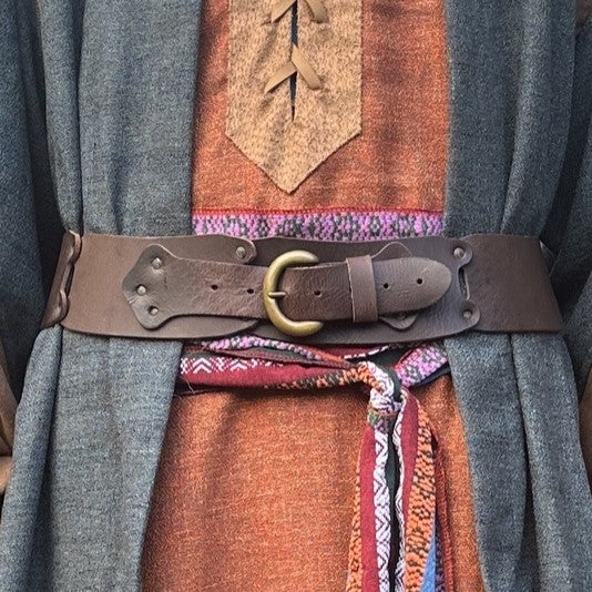 This belt has a distinguished metal buckle and is made from brown Buffalo leather sections linked with metal rivets. The space between each link allows you to add accessories or magic items to enchant your character.