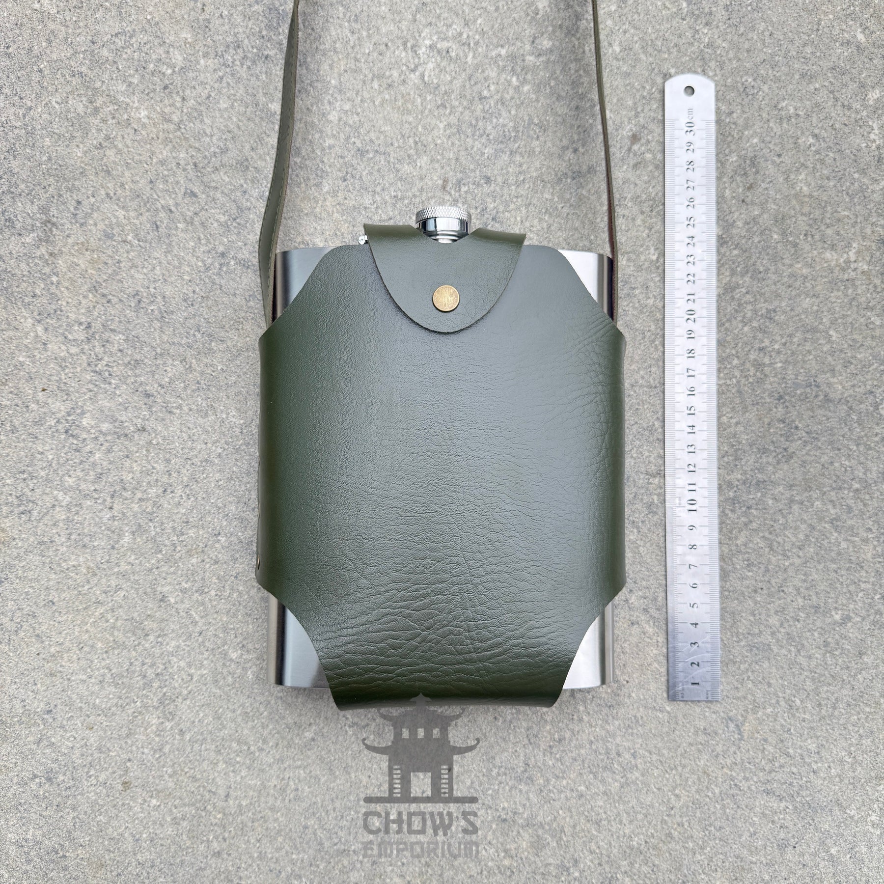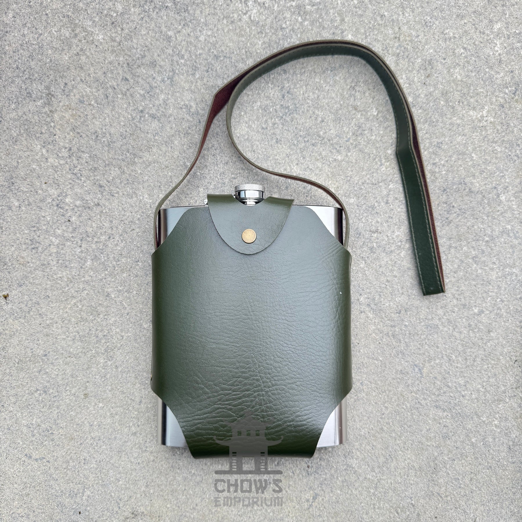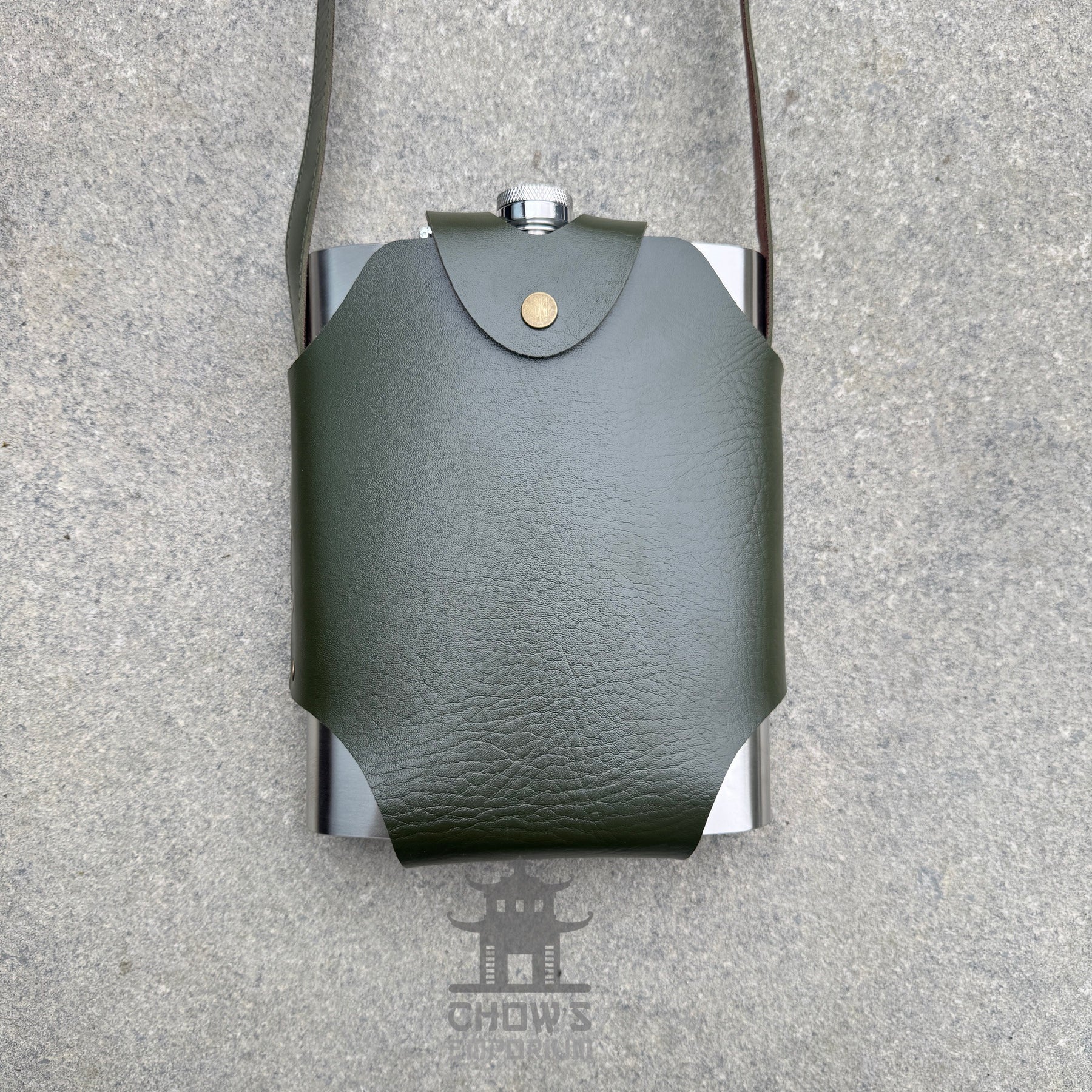 48oz Rectangular Hip Flask in Green Leather with Shoulder Strap