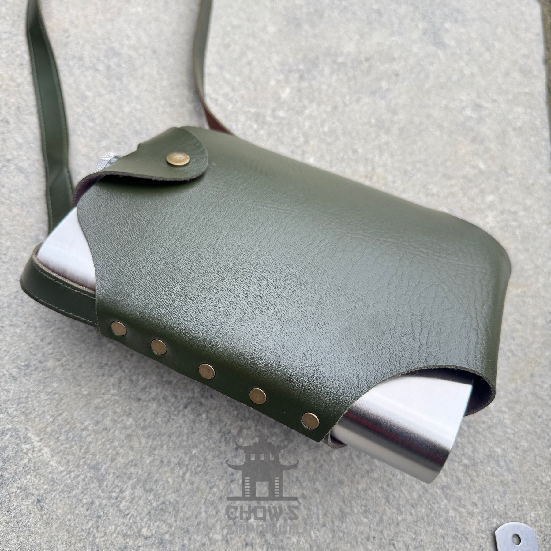 - green leather holder with shoulder strap