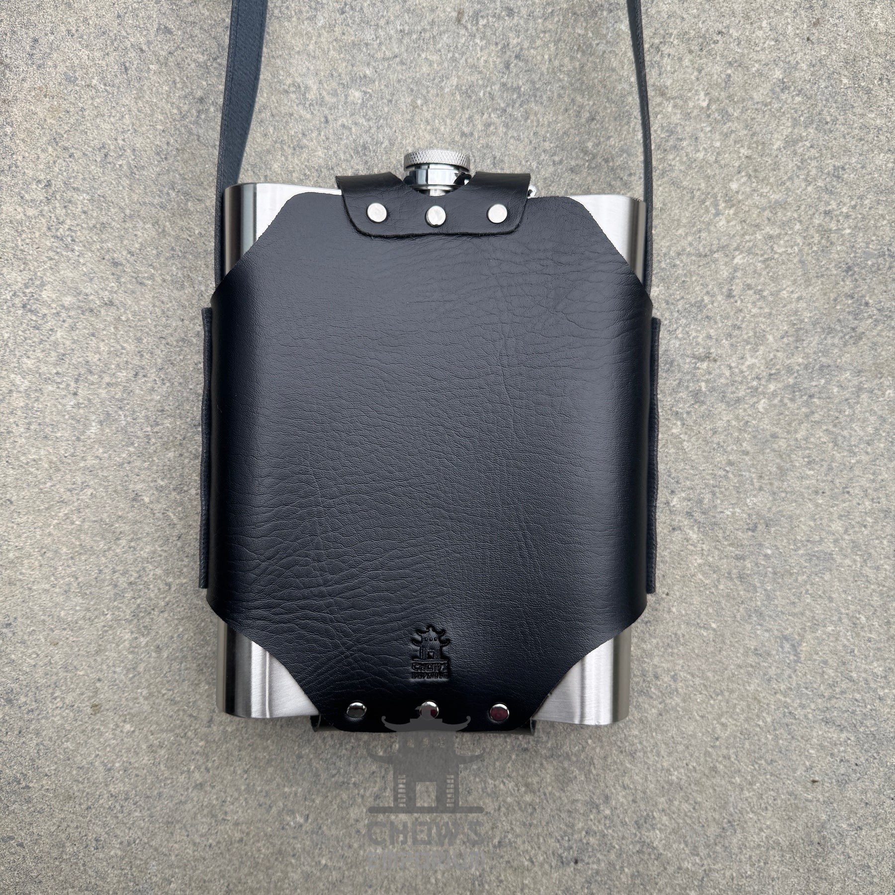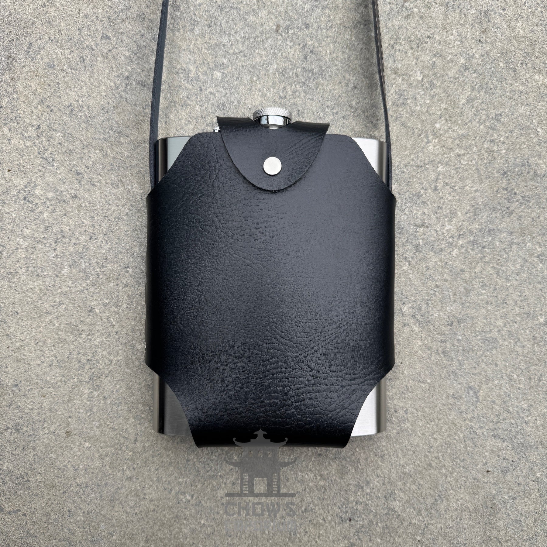 Large rectangular stainless steel hip flask in a faux leather holder. The shoulder strap allows you to wear the flask across your body for easy access while keeping your hands free for quests, trading, or battle. A secure screw cap prevents leaks, while the leather carrier keeps your flask protected and easy to carry.