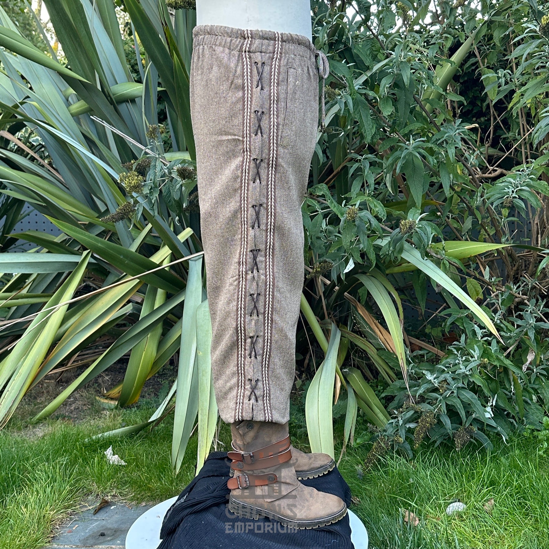 Straight Leg Side Lace Pants - Soft Woollen trousers with a relaxed, straight-leg fit, elasticated waistband with cord tie, side-lace stitching, reinforced for durability.