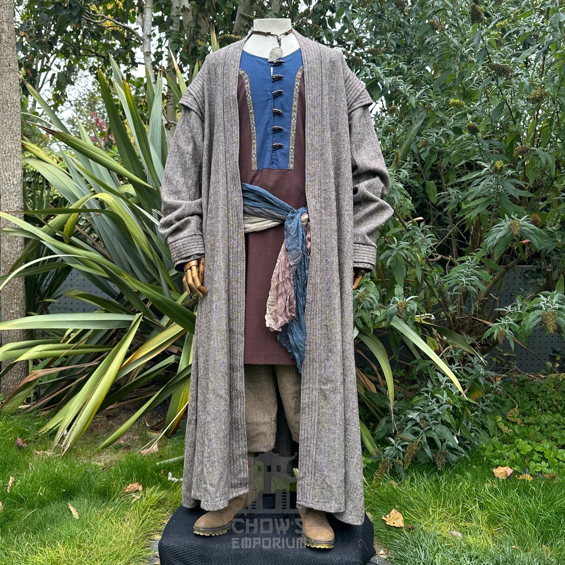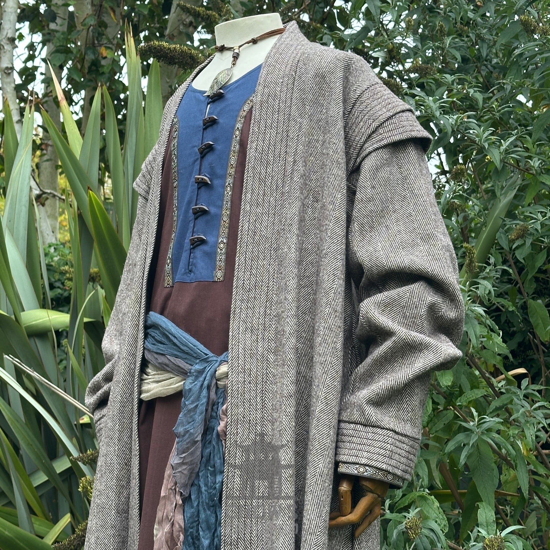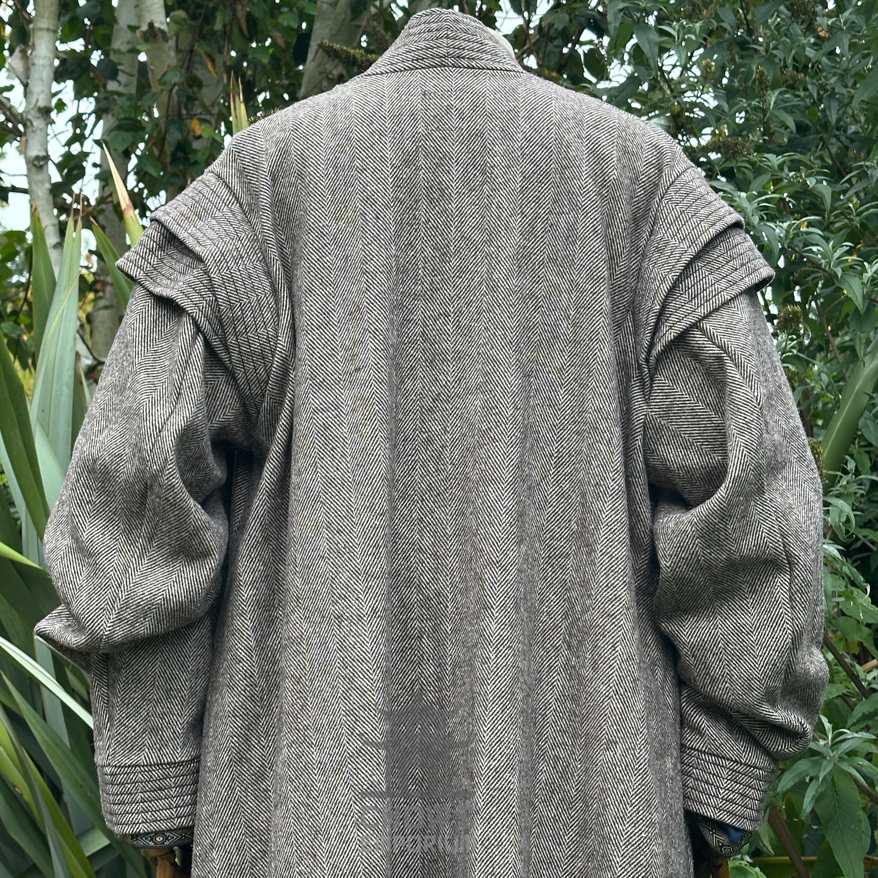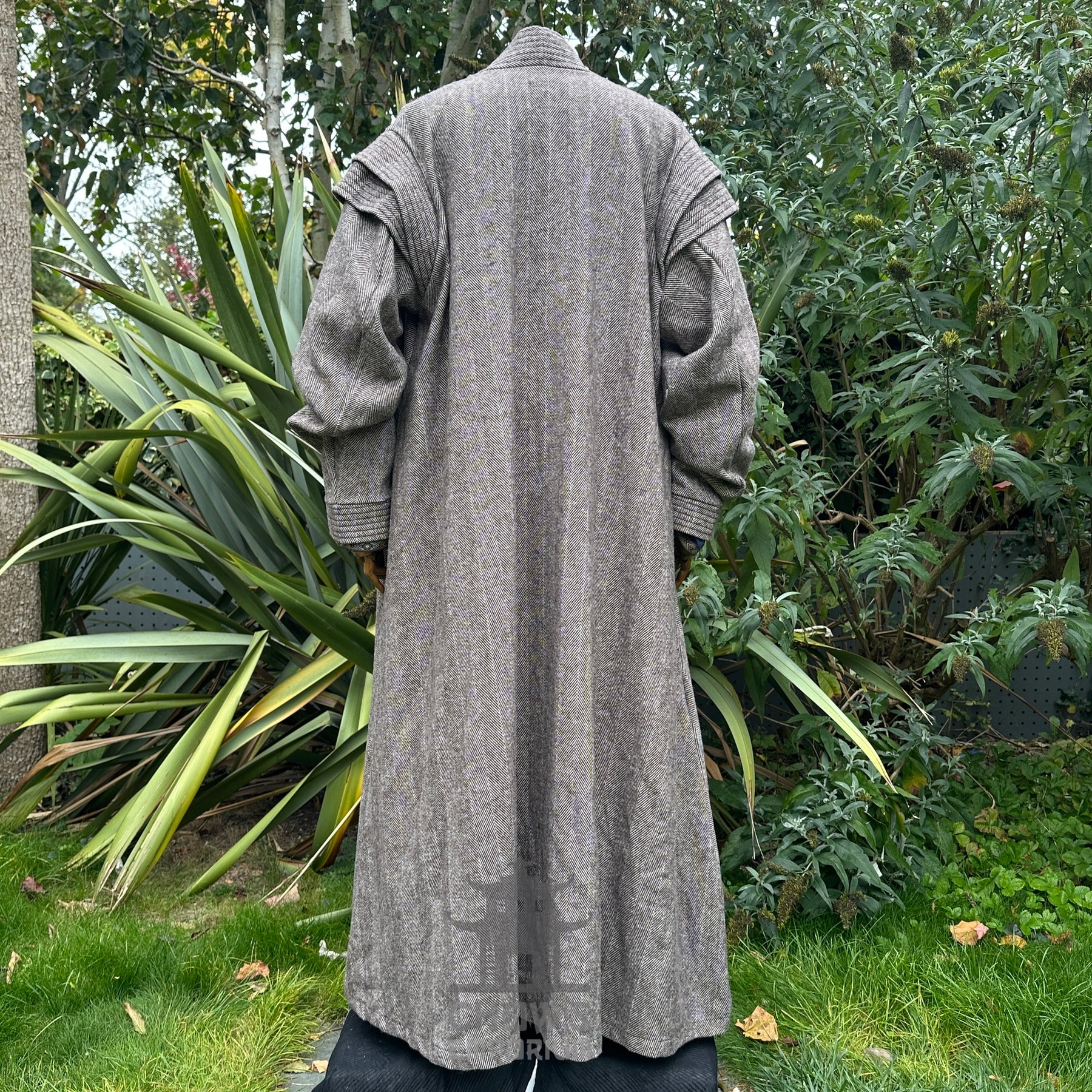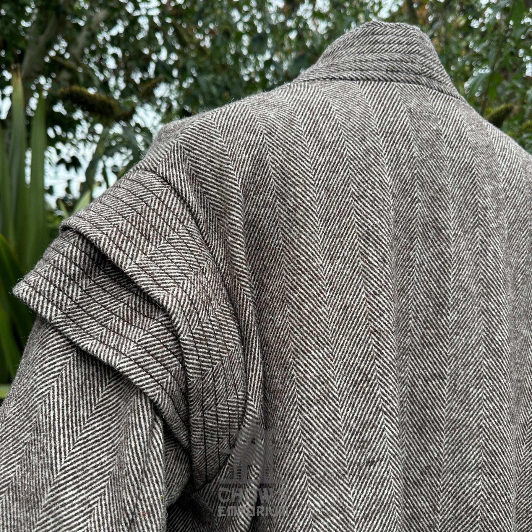 Apprentice Robe – Herringbone wool-mix robe with full-length unisex design, hidden pockets, and versatile open-or-belted styling.