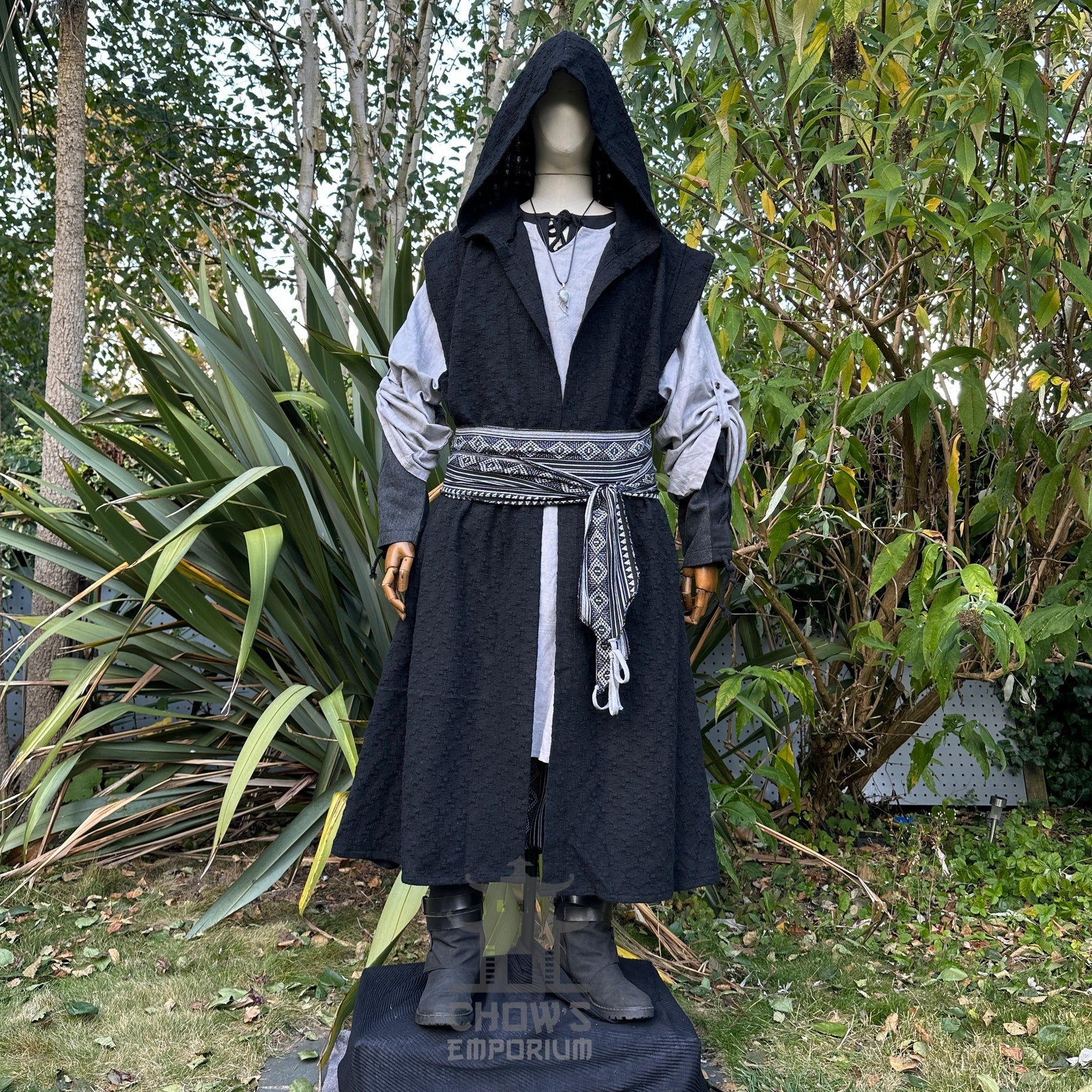 The Medieval Viking Lord LARP Outfit features a black hooded robe crafted from high-quality textured fabric, blending style and function for a timeless, fantasy-inspired look. The sleeveless robe makes this outfit perfect for layering over tunics or armor, offering comfort and durability for LARP, renaissance faire, and historical roleplay events.