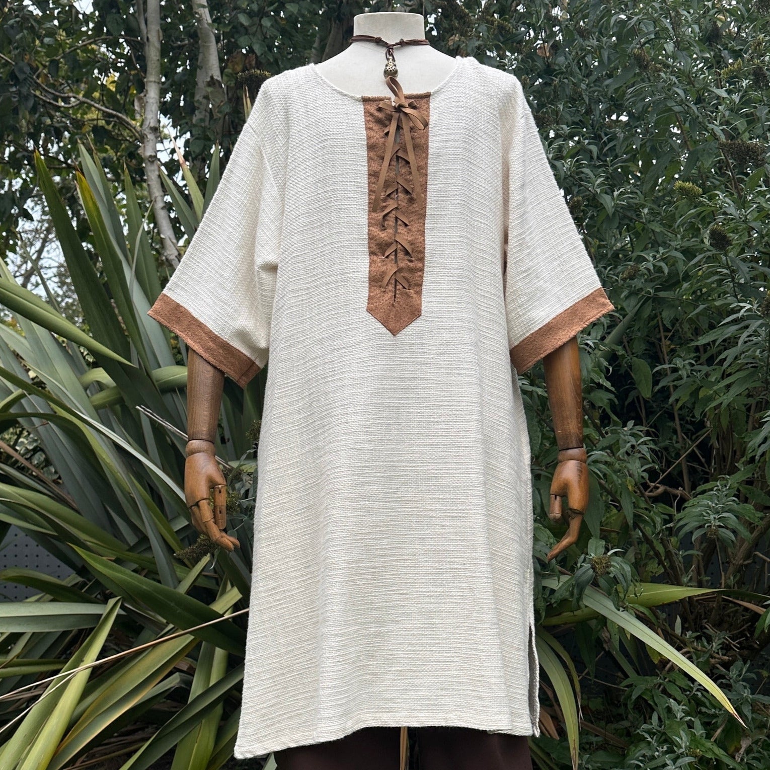 A rugged, adventure-ready white and brown tunic designed for LARP, Viking, Celtic, Roman, Ranger, Warrior, Druid, Fantasy Cosplay, and Renaissance Faire quests—crafted to offer comfort, authenticity, and practical utility for every journey.