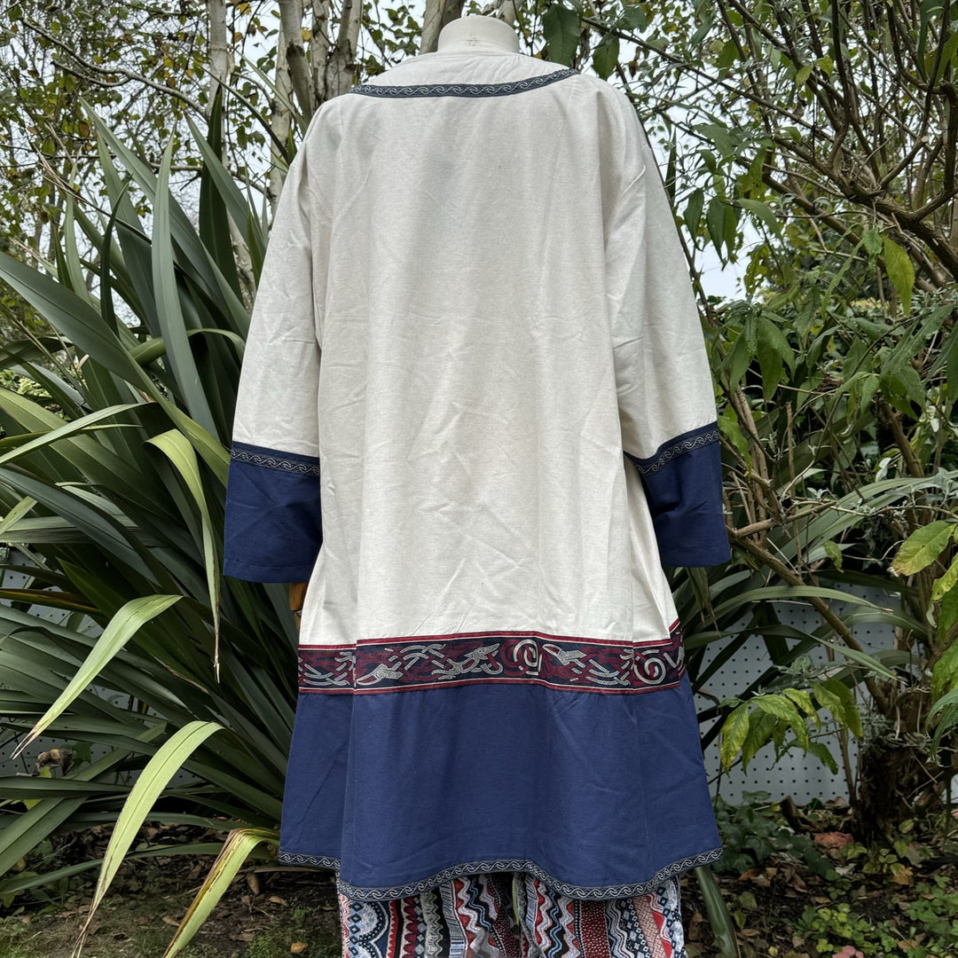 - White and Blue Two-Tone Linen Tunic with Braiding