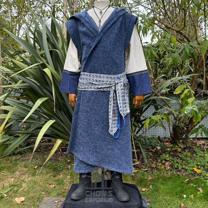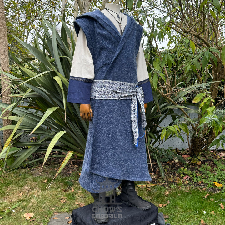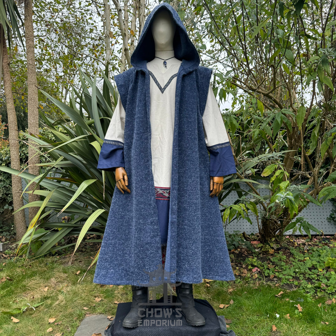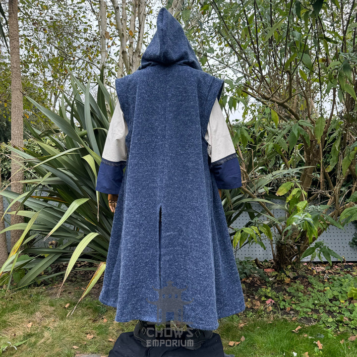 Step into character with this Blue Hooded Sleeveless Robe, crafted from a warm and breathable wool blend for all-day comfort. This robe blends authentic medieval aesthetics with modern practicality.