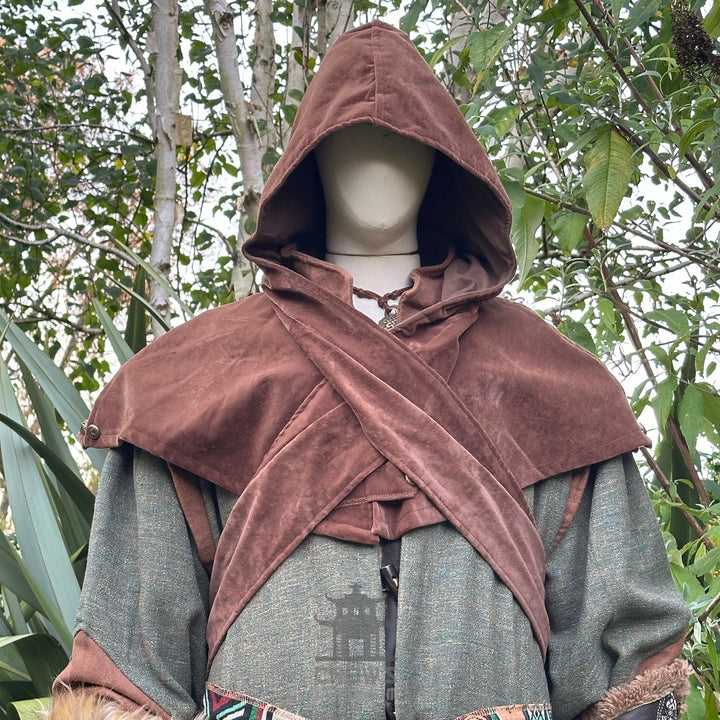 This hood is made in suede effect material and features a built in wrap around function which gives a distinctive look to your character even from the back. Will keep the wind off your neck and can act as a disguise for mysterious characters.