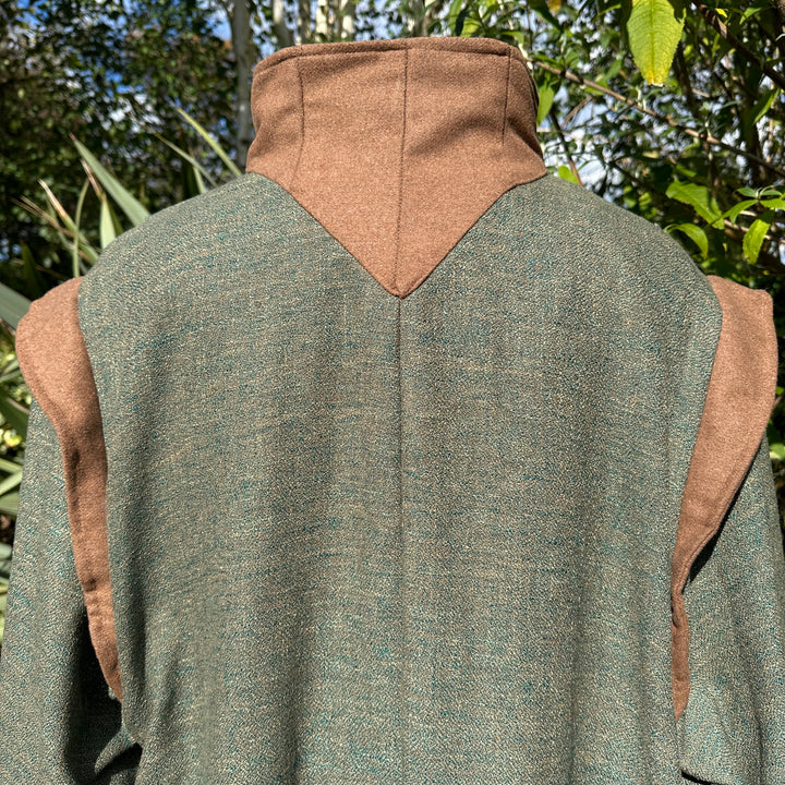This long robe, constructed from textured fabric with contrasting neck, shoulder and sleeve details, combines elegance with functionality. Featuring a high collar for a distinguished look, its large armholes allow for a wide range of movement, and the longer sleeves protect your hands when wearing vambraces - perfect for LARP and Renaissance Faires. The robe's back flare adds a touch of drama, ensuring your stride and movements flow gracefully.